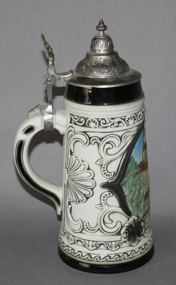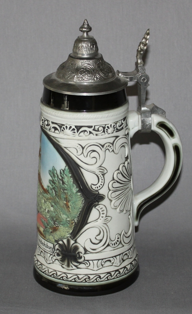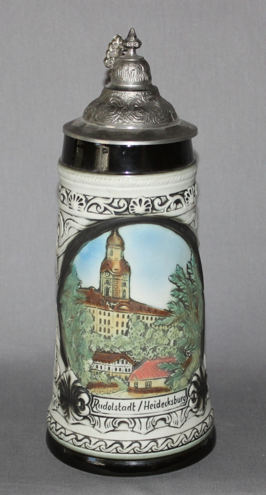 #1 Fayence. Ernst Bohne Söhne – Rudolstadt / Thüringen. Bierkrug mit polychrome Reliefabbildung “Rudolstadt / Heidecksburg“ mit Zinndeckelmontierung. Auf der Unterseite mit blauer Stempelmarke “Ankler“. Produktion aus der 2. Hälfe des 20. Jhrdts. Höhe (Ohne Montierung) 22 cm und Durchmesser am oberen Rand 6,8 cm. (20)