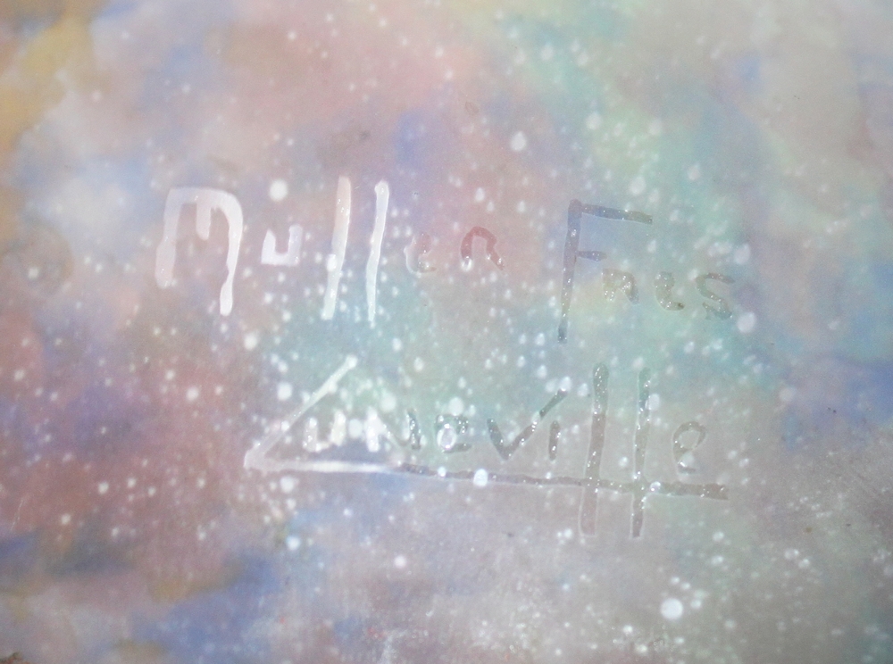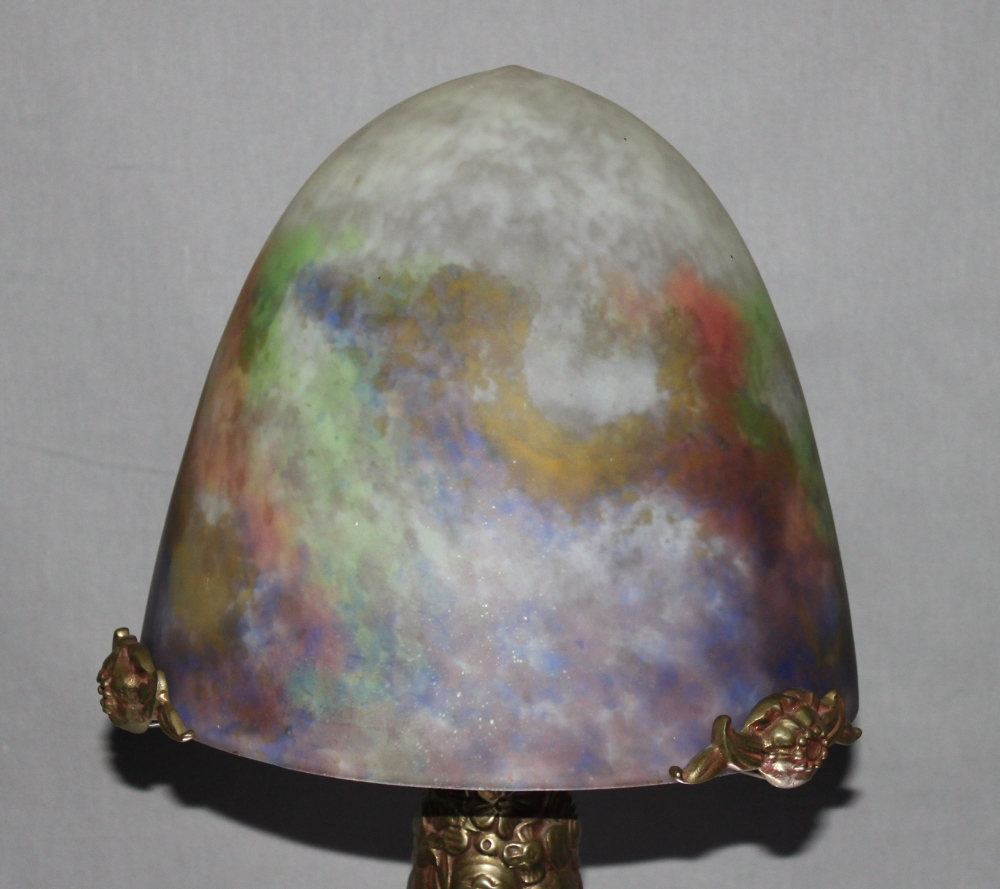 #3 Jugendstil. Tischlampe aus Metall mit kegelförmigen Lampenschirm aus opakem mattiertem Glas mit der blankgeätzten Ätzsignatur “Muller Fres. Luneville“. Einflammig, Lampenfuß und Haltebügel aus dunkel patiniertem Metall mit Dekor. Aus den 1930er Jahren. Lampe Höhe 53 cm. Durchmesser Lampenschirm 22 cm und Höhe 19 cm. (18)