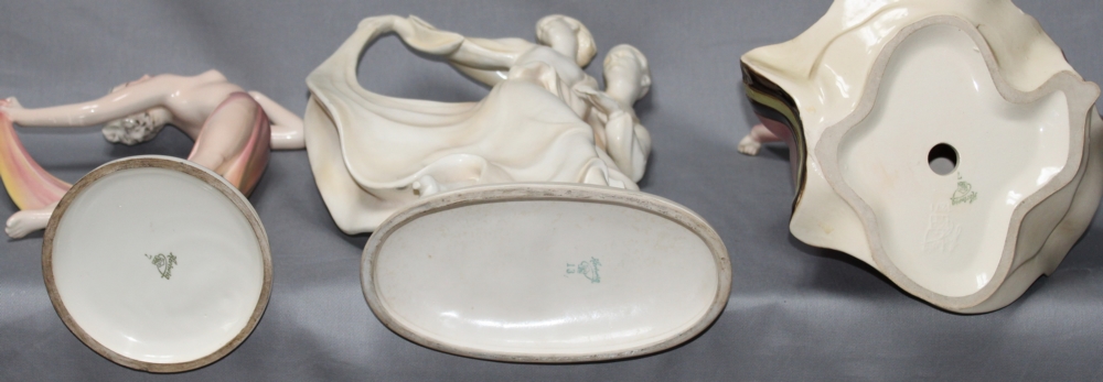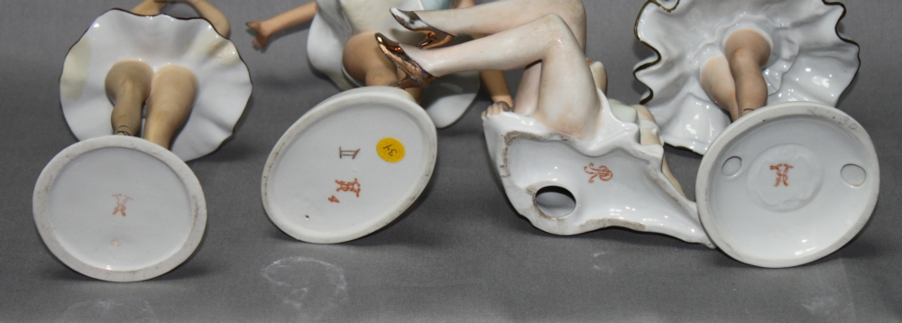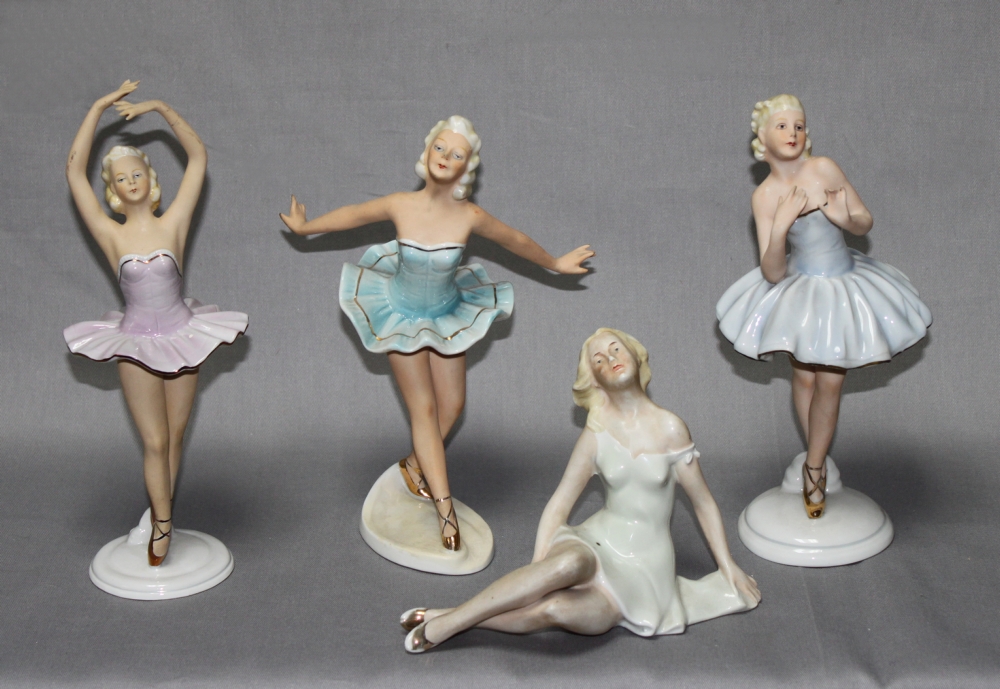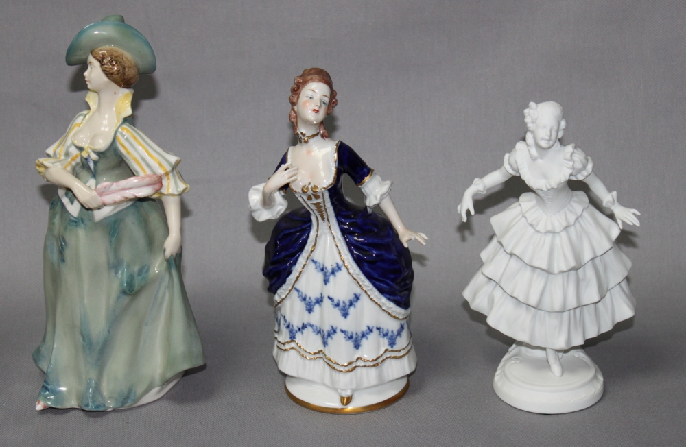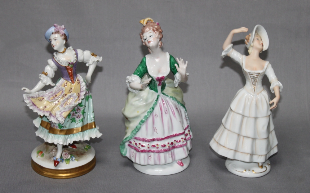 #14 Porzellan. Fasold & Stauch - Wallendorf/Thüringen. Drei Tänzerinnen. Drei einzelne, unterschiedliche Figuren, mattes Inkarnat, pastelltonig farbige Porzellanfiguren. Auf der Unterseite jeweils mit rötlicher Stempelmarke “F S“. Produktion aus der 2. Hälfte des 20. Jhrdts. Unterschiedliche Höhen. (20)