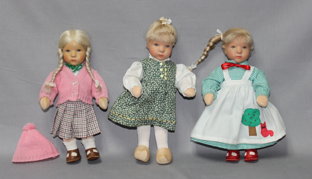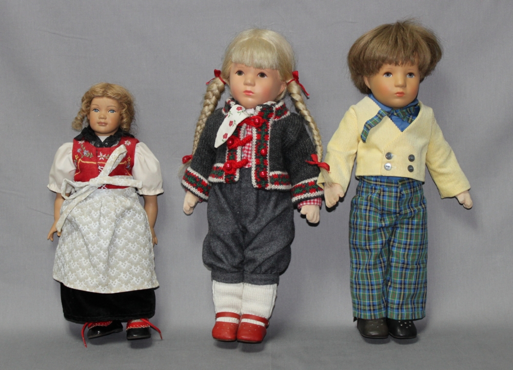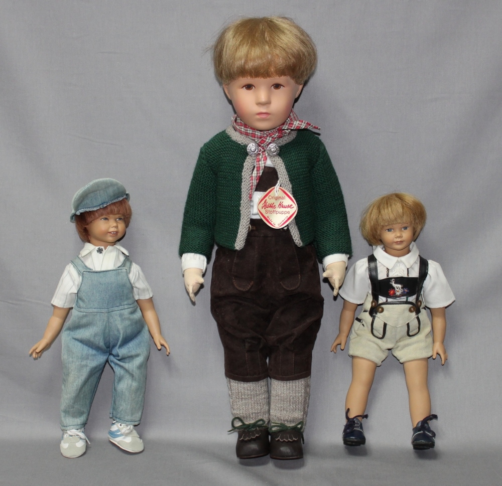 #6 Kinderspielzeug. Puppen. Käthe Kruse (?) Drei Stoffpuppen, bekleidete Gelenkgliederpuppen aus Stoff mit beweglichem Köpfen. Deutsche Produktion aus der zweiten Hälfte des 20. Jhrdts. Größe jeweils 25 cm. (18)