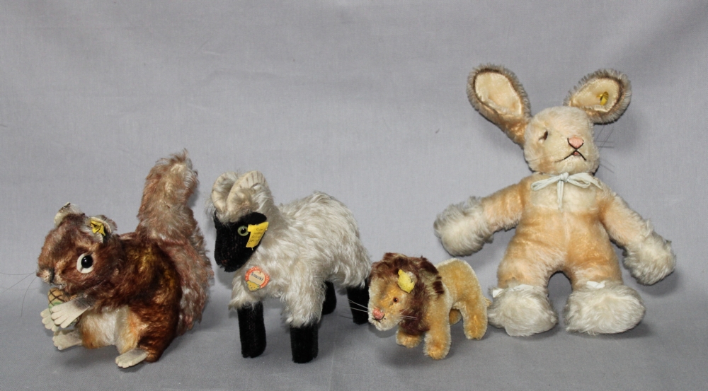 #9 Kinderspielzeug. Steiff. Vier Stofftiere, original Steiff mit Knopf. Gefertigt aus unterschiedlichen Materialien. Aus der Produktion 2. Hälfte des 20. Jhrdts. Verschiedene Größen und Höhen. (18)