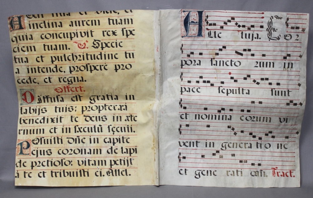#10 Pergament. Lateinische Notenhandschrift auf Pergament des 18. Jhrdts., vermutlich Spanien. Folio – Doppelblatt, handgeschrieben in schwarzer Tinte aus einem lateinischen Antiphonar (?) mit 5 roten Noten – Linien, zwei verzierten Großbuchstaben (A + B) in blau und 3 kleineren Buchstaben (A + P) in Blau, ein “D“ in Rot ausgeführt. Einige freie Felder sind nicht fertiggestellt. Größe der Einzelseite: 47 x 57 cm, aufgeklappt 94,5 x 57 cm. (12)