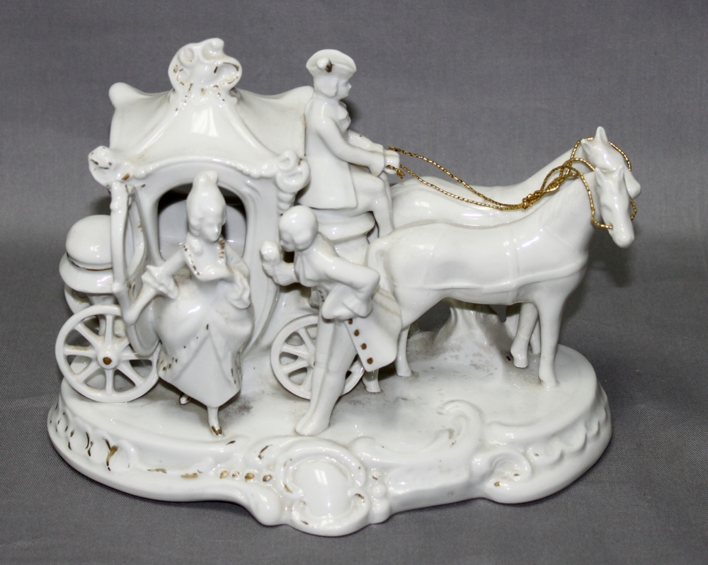 #11 Porzellan. Carl Scheidig in Gräfenthal / Thüringen. Galantes Paar an einer Kutsche. Monochrome Porzellanskulptur nach einen historischen Vorbild auf flachem Sockel. Auf der Unterseite mit blauer Porzellanmarke “Krone mit S“ und darunterliegendem Schriftzug “Gräfenthal Germany“. Produktion aus der 2. Hälfte des 20. Jhrdts. Abmessungen (Lange x Breite x Höhe) 23 x 12 x 17 cm. (20)