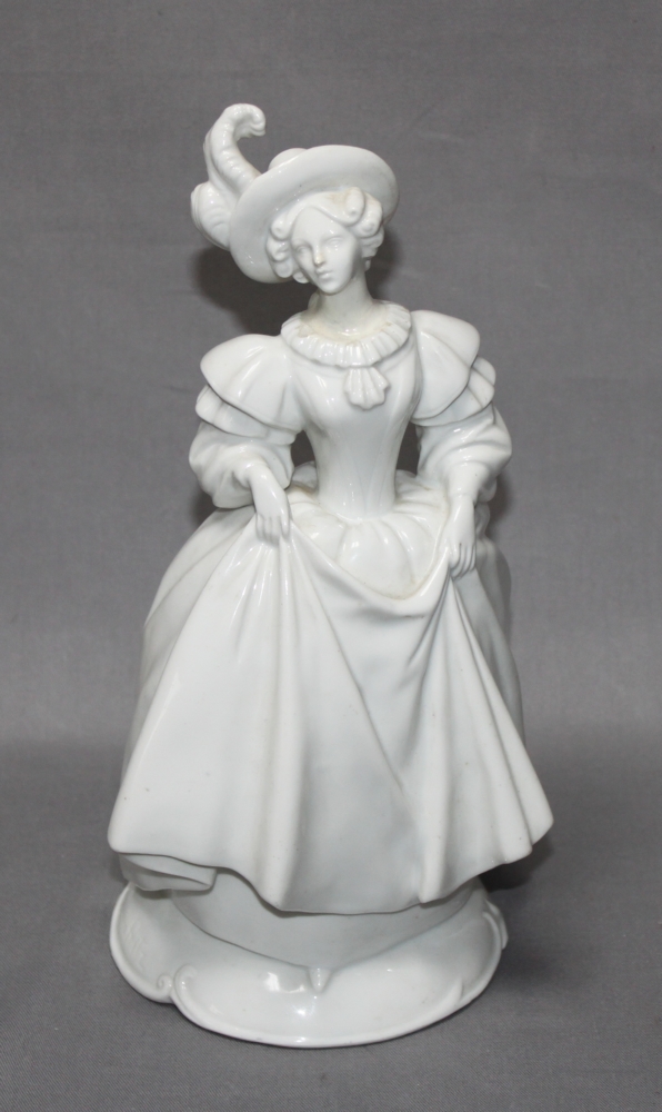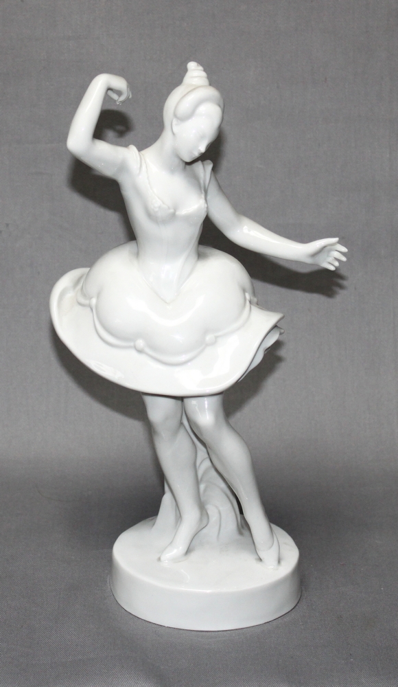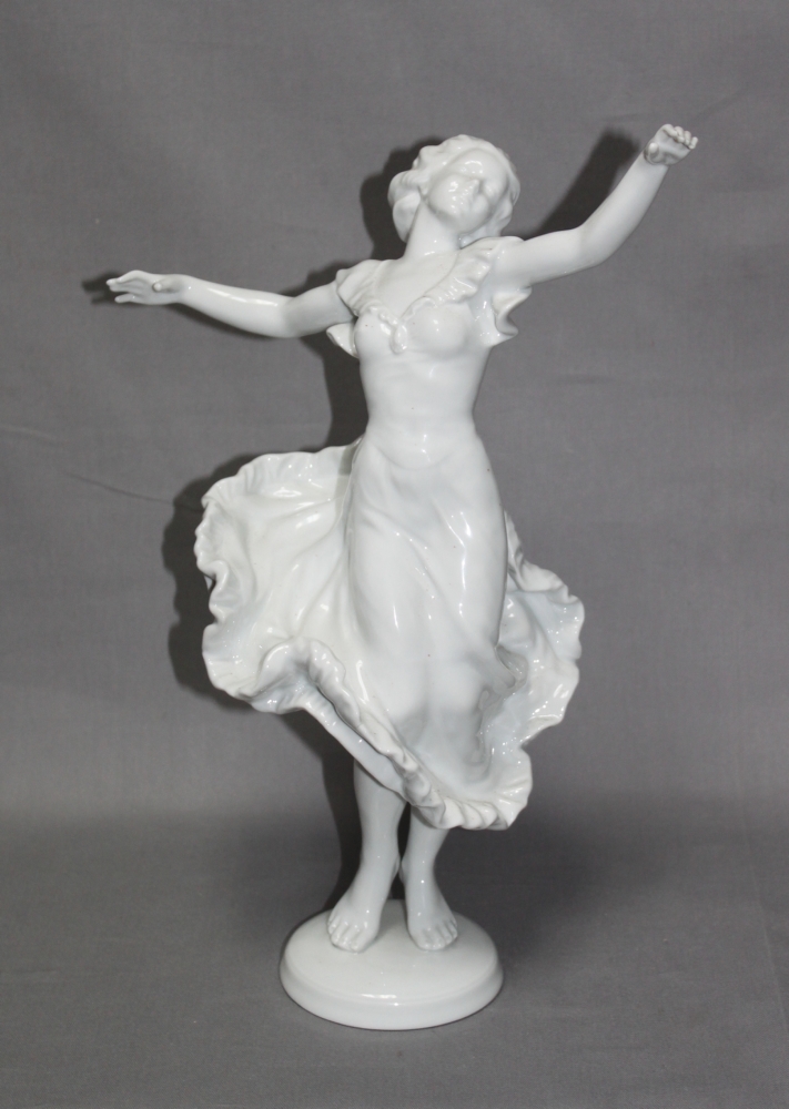 #54 Porzellan. Schwarzburger Werkstätten für Porzellankunst - Rudolstadt. “Tanzende Mädchen“. Monochrome Porzellanfigur auf flachem . Auf der Oberseite des Sockels mit Pressstempel “Claire Volkhart“. Auf der Unterseite mit Presstempel “Fuchs“ und Blaustempel “Aelteste Volkstedter Porzellanfabrik 1762“. Produktion aus der 2. Hälfte des 20. Jhrdts. Höhe 25,5 cm. (20)