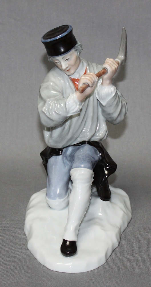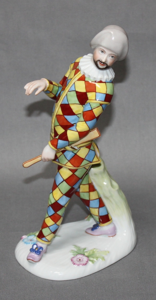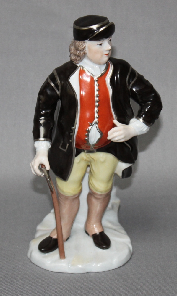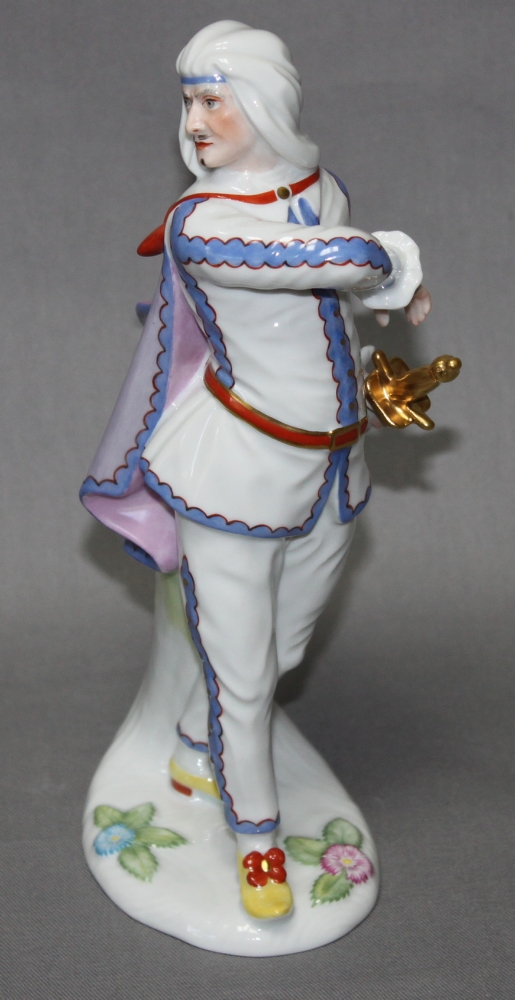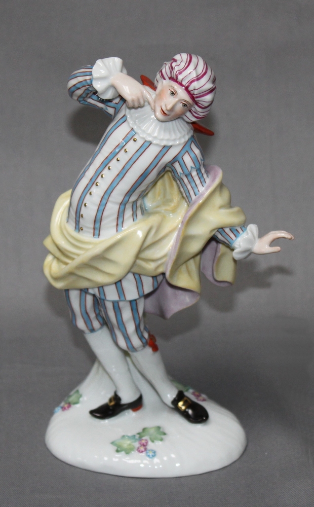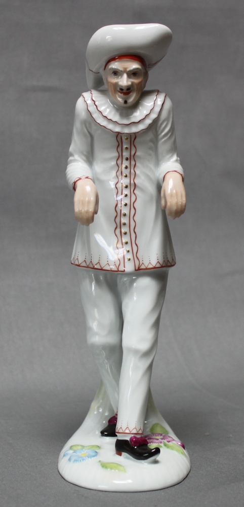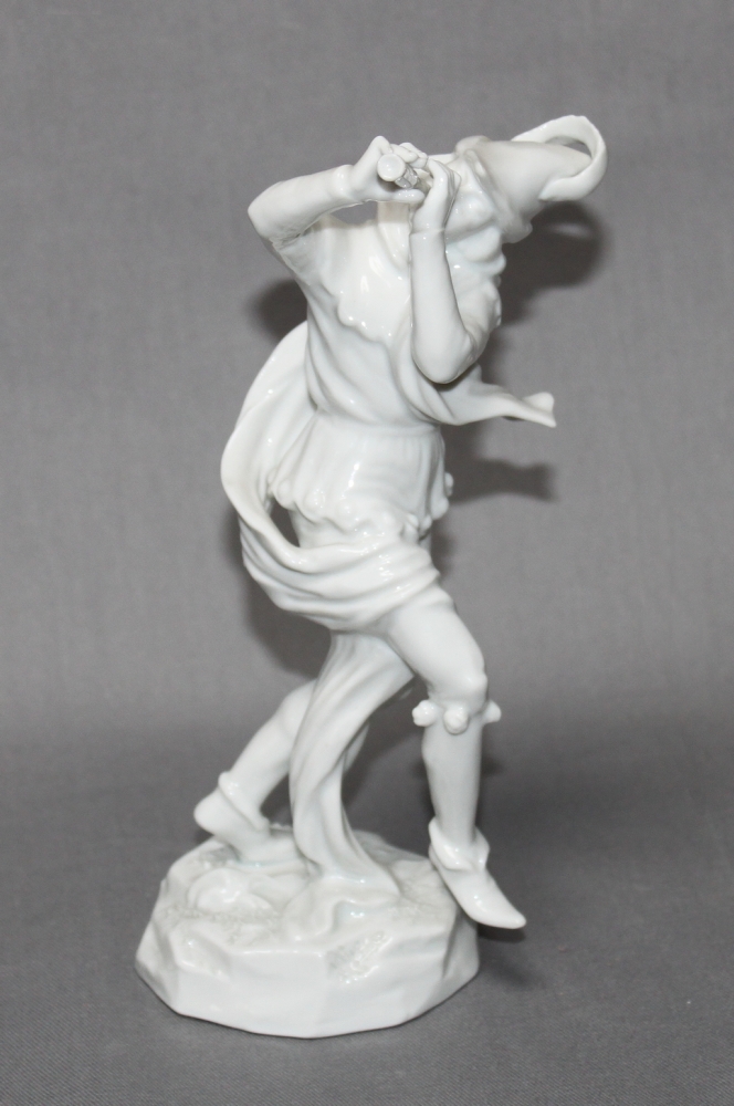 #58 Porzellan. Volkstedt - Aelteste Volkstedter Porzellanfabrik. Tanzender Narr. Monochrome Porzellanfigur auf flachem naturalistischen Sockel. Auf der Unterseite mit Blaustempel “Aelteste Volkstedter Porzellanfabrik 1762“. Produktion aus der 2. Hälfte des 20. Jhrdts. Höhe 19,0 cm. (20)