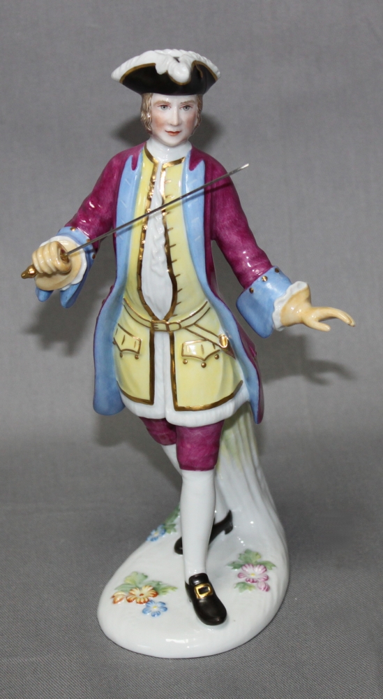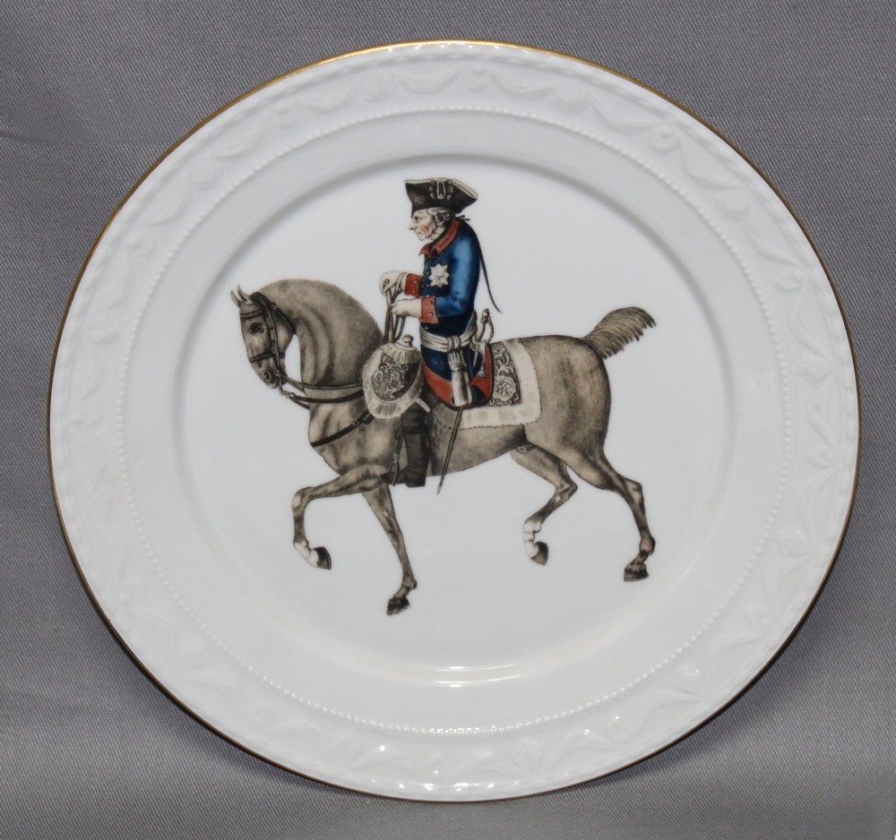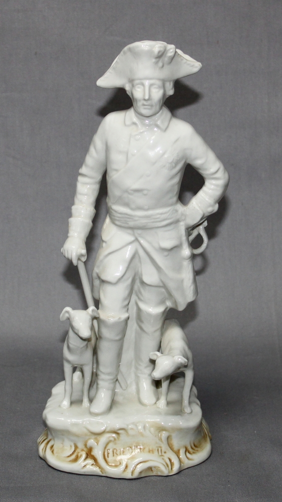 #55 Porzellan. Thüringer Porzellan. Monochrome Porzellanfigur “Friedrich den Große“, in typischer Haltung, aufrecht stehend, mit Dreispitz, Degen und Spazierstock, flankiert von seinen zwei Windhunden. Auf der Unterseite mit Porzellanmarke “X“ in Unterglasurblau – keine Schwertermarke. Aus der Produktion der1980er Jahre. Höhe der Figur 27 cm. (31)