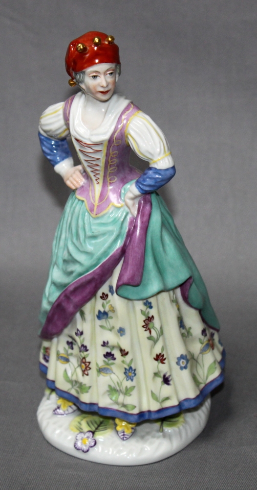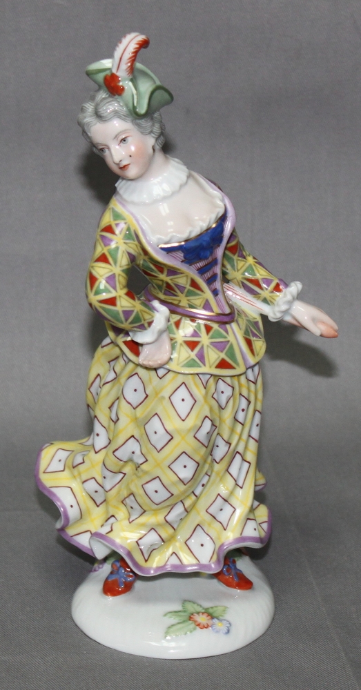 Die elegante und schöne polychrome Porzellanfigur zeigt eine