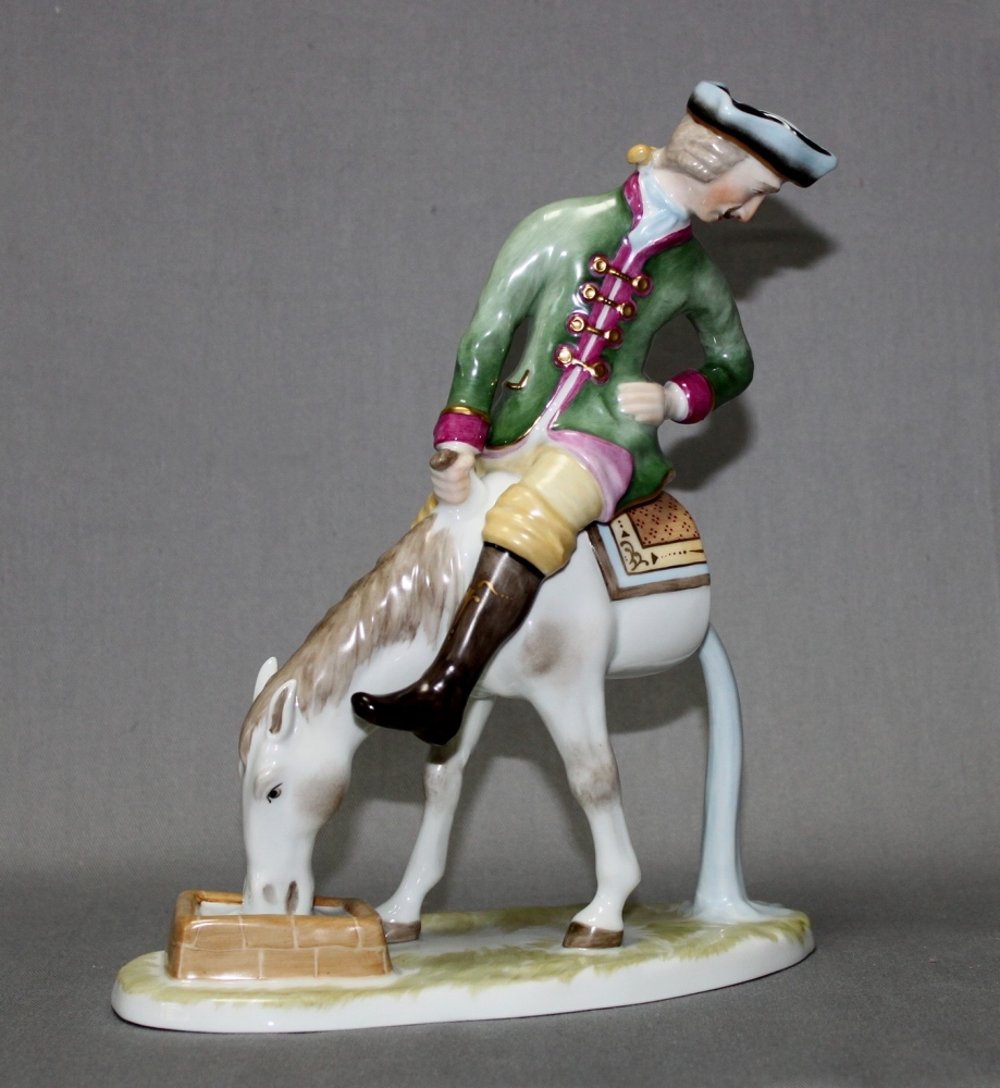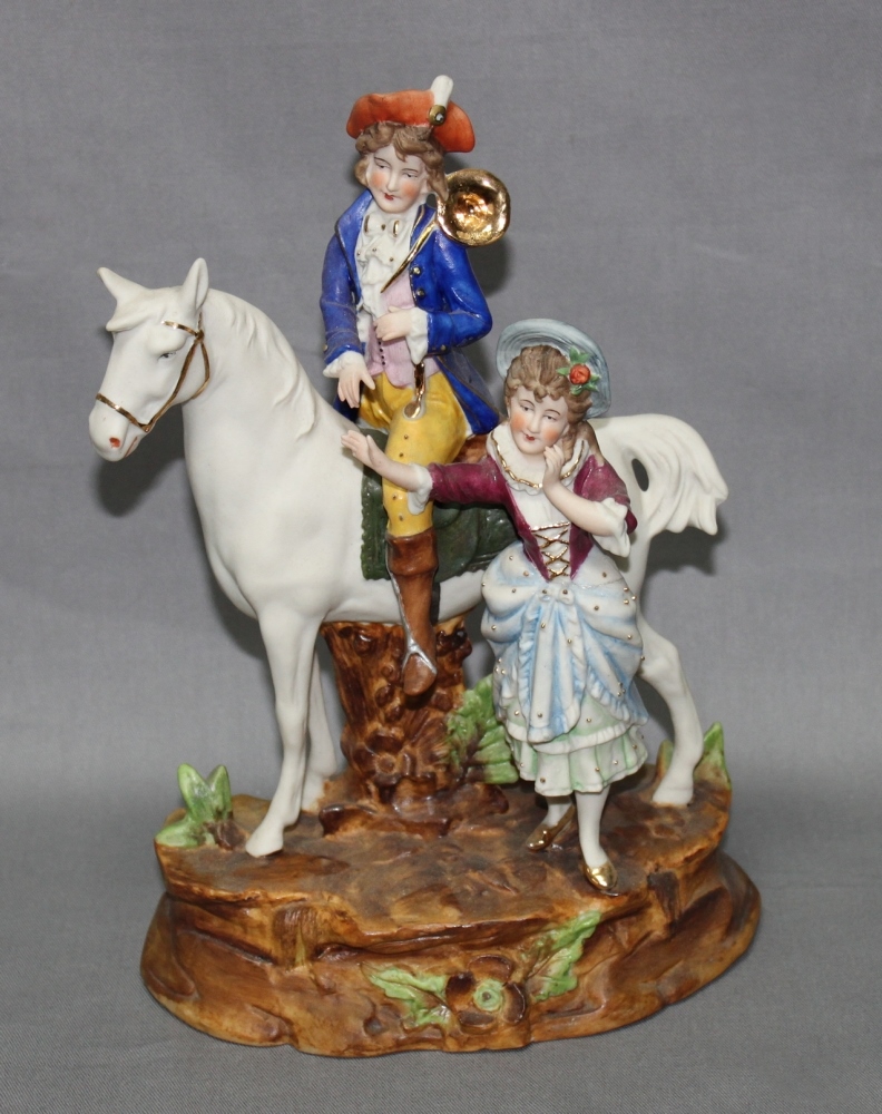 naturalistischen Sockel steht junges Liebespaar, er sitz auf seinem Perd und