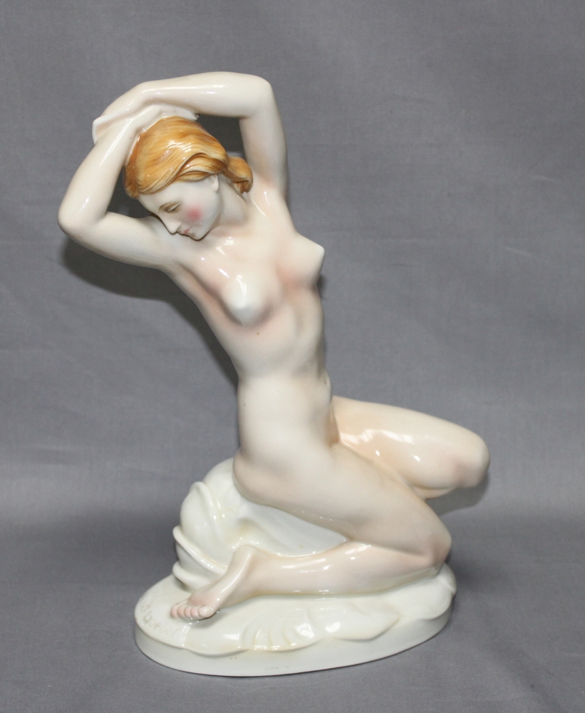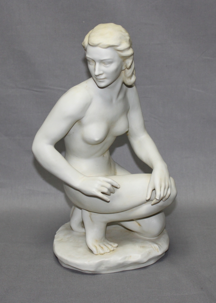 #52 Porzellan. Scheibe - Alsbach / Thüringen. Aktdarstellung – kniende junge Frau. Monochrome Biskuitporzellanskulptur nach einen historischen Vorbild auf naturalistischen flachen Sockel. Auf der Unterseite mit blauer Porzellanmarke “S mit horizontalen gekreuzten Strichen“. Produktion aus der 2. Hälfte des 20. Jhrdts. Höhe 30 cm. (20)