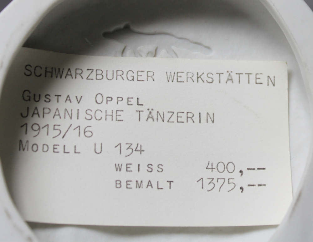 #53 Porzellan. Schwarzburger Werkstätten für Porzellankunst - Rudolstadt. “Japanische Tänzerin“ auf flachem Sockel. Monochrome Porzellanfigur. Auf der Oberseite hinter der Tänzerin Pressstempel “G Oppel“. Auf der Unterseite mit Presstempel “Fuchs“, in inneren Rand Blaustempel “Aelteste Volkstedter Porzellanfabrik 1762“. Produktion aus der 2. Hälfte des 20. Jhrdts. Höhe 32 cm. (20)