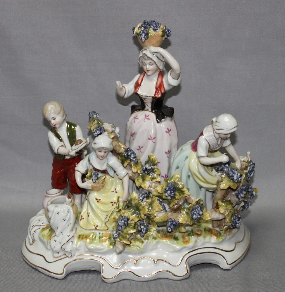 #56 Porzellan. Thüringer Porzellan. Weinlese. Polychrome Porzellanfiguren in ländlicher Tracht bei der Ernte von Weintrauben. Auf der Unterseite ist keine Porzellanmarke mehr vorhanden, bzw. sie wurde ausgeschliffen. Produktion aus der zweiten Hälfte des 20. Jhrdts. Abmessungen (Lange x Breite x Höhe) 25 x 15 x 26 cm. (20)