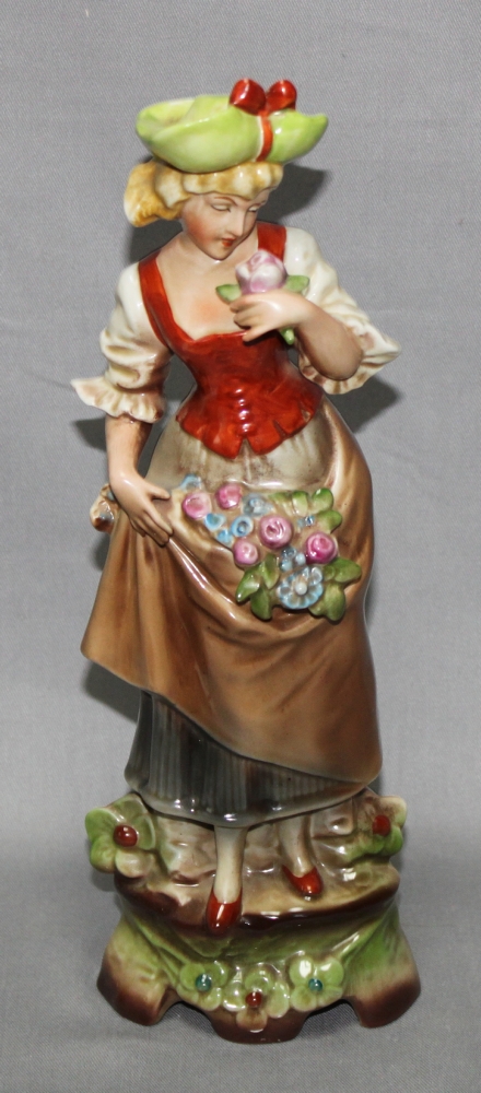 #59 Porzellan. Wagner & Apel - Lippelsdorf / Thüringen. Blumenmädchen. Polychrome Porzellanfigur in ländlicher Tracht. Auf der Unterseite mit blauer Porzellanmarke “Krone 1877 - GDR“. Produktion aus der 2. Hälfte des 20. Jhrdts. Höhe 28,5 cm. (20)