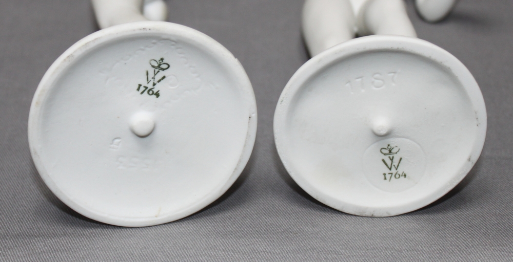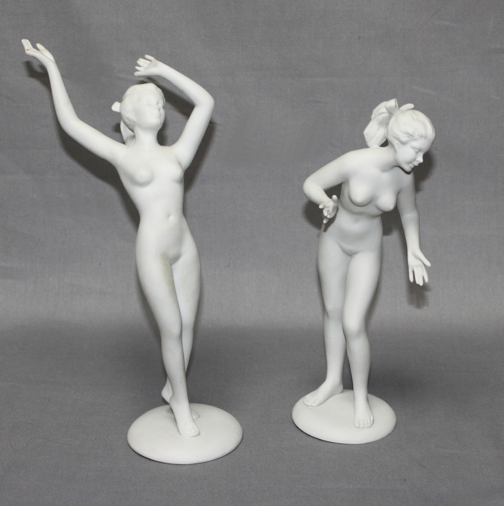 #62 Porzellan. Wallendorf. Aktdarstellung – Zwei stehende junge Frauen. Zwei unterschiedliche monochrome Biskuitporzellanskulpturen auf flachem runden Sockel. Auf der Unterseite jeweils mit grüner Stempelmarke “Krone – W – 1764“. Produktion aus der 2. Hälfte des 20. Jhrdts. Höhe 24 und 21,5 cm. (20)