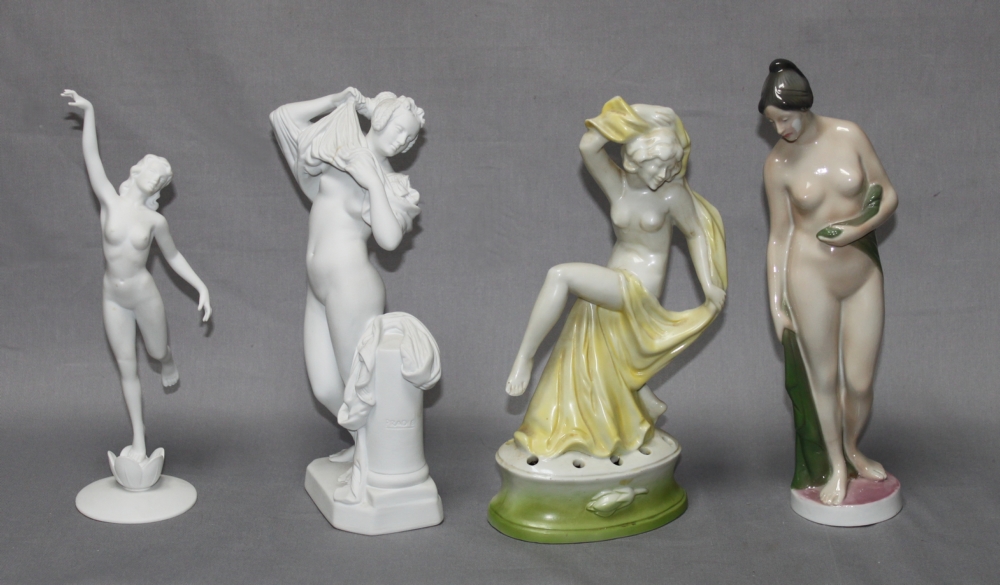 #64 Porzellan. Beispielsammlung Weibliche Porzellanfiguren zum Teil Aktdarstellungen. Acht polychrome Porzellanfiguren, verschiedene Höhen, unterschiedliche Hersteller. (20)