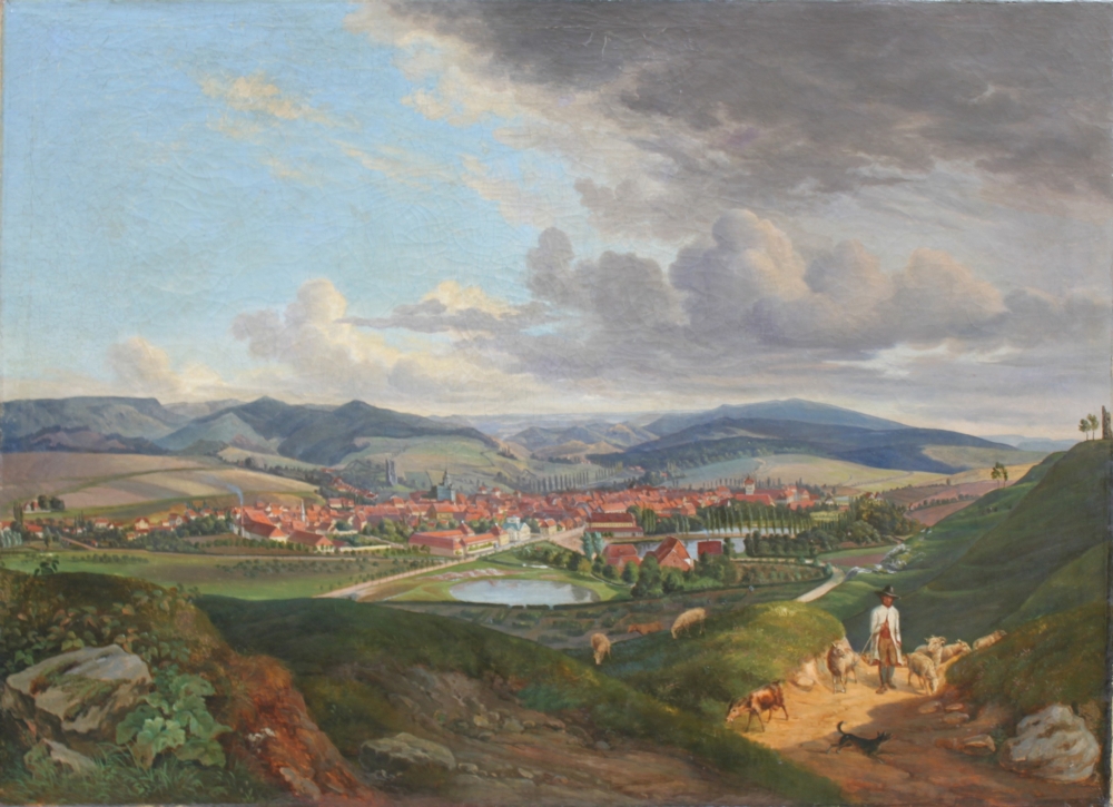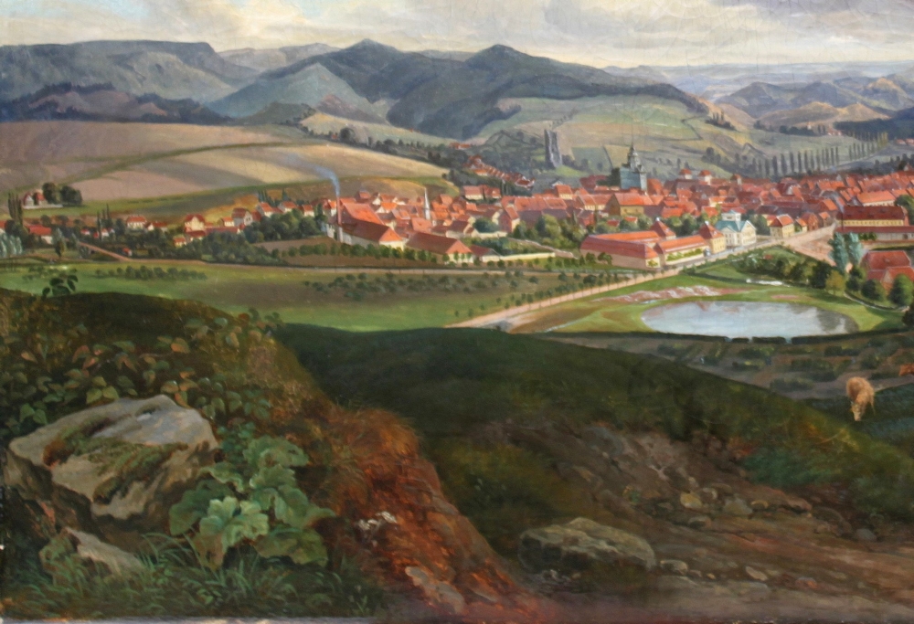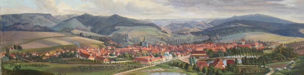 71 Osterode am Harz. “Ansicht von Osterode“ von Wilhelm Ripe. Ölgemälde auf Leinwand (doubliert). Auf der Rückseite mit kleinem Notizzettel am Keilrahmen. Nicht signiert und datiert, Malerei aus den 1850er Jahren. Bildgröße 108 x 78 cm. Rahmengröße 112 x 83 cm (Querformat). (33)