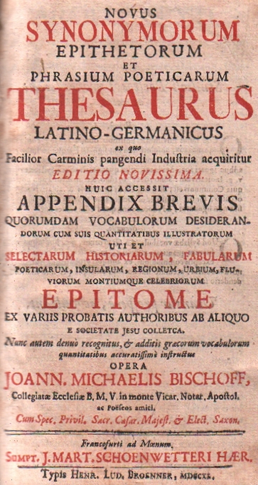 98 Bischoff, Johann Michael. Novus Synonymorum Epithetorum et phrasium poeticarum Thesaurus latino-germanicus, ex quo Facilior Carminis pangendi Industria acquiritur editio novissima. Huic accessit appendix brevis … uti et Selectarum, Historiarum, Fabularum, poeticarum, insularum, regionum, urbium, fluviorum montiumque celebriorum Epitome. Ex variis probatis autoribus ab aliquo e Societ. Jesu collecta. Nunc autem denuo recognitus, & additis graecorum vocabulorum quantitatibus accuratissime instructus. 2 Teile in 1 Band. Frankfurt /M., Schoenwetter, 1740. Lex. 8°. Mit gestochenem Frontispiz, Titel in rot und schwarz, 6 Bll. 943 S.; 144 S. (incl. Titel). Blindgeprägter Schweinslederband über 4 Bünden mit zwei schlichten Schließen. (12)