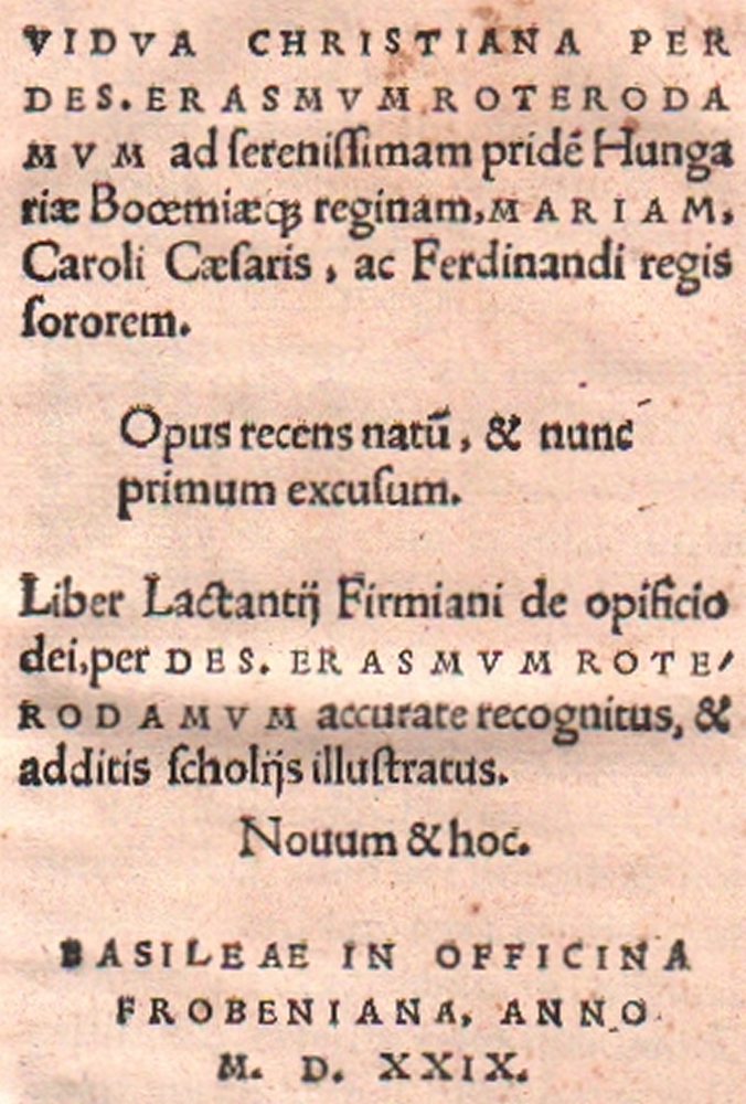 100 Erasmus Roterodamus, D. Vidva Christiani per… mvm ad serenissimam pride Hungariae Bocemiae reginam Mariam… Opus recens natu, & nunc primum excusum. Liber Lactantij Firmiani de opificio dei… accurate recognitus, & additis scholijs illustratus. Nouum & hoc. Basel, Froben (Johann Erben), 1529. 8°. 318 Seiten, 1 Bl. mit Druckermarke. Brauner Lederband mit Blindprägung und Rollenstempelverzierungen. Die Schließbänder fehlen. (11)