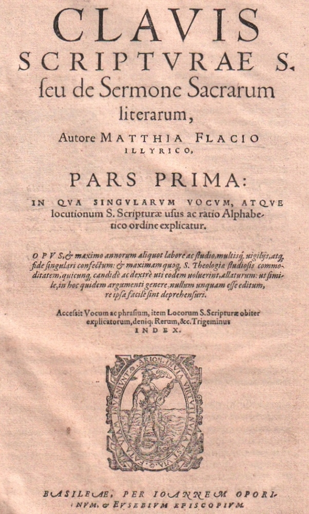 101 Flacius, Illyricus Matthia. Clavius scipturae s(anctea) seu de Sermone Sacrarum literaruim. Pars Prima: (von 2) In qua singularum vocum, atque locutionum S. Scripturae usus ac ratio Alphabetico ordine explicator… Basel, Joh. Oporinus & E. Episcopius. 1567. 4°. 8 Bll. 1782 Spalten, 42 Bll. davon letztes Blatt mit Druckermarke. Orig. blindgeprägter Schweinslederband ohne die Schließbänder. (11)