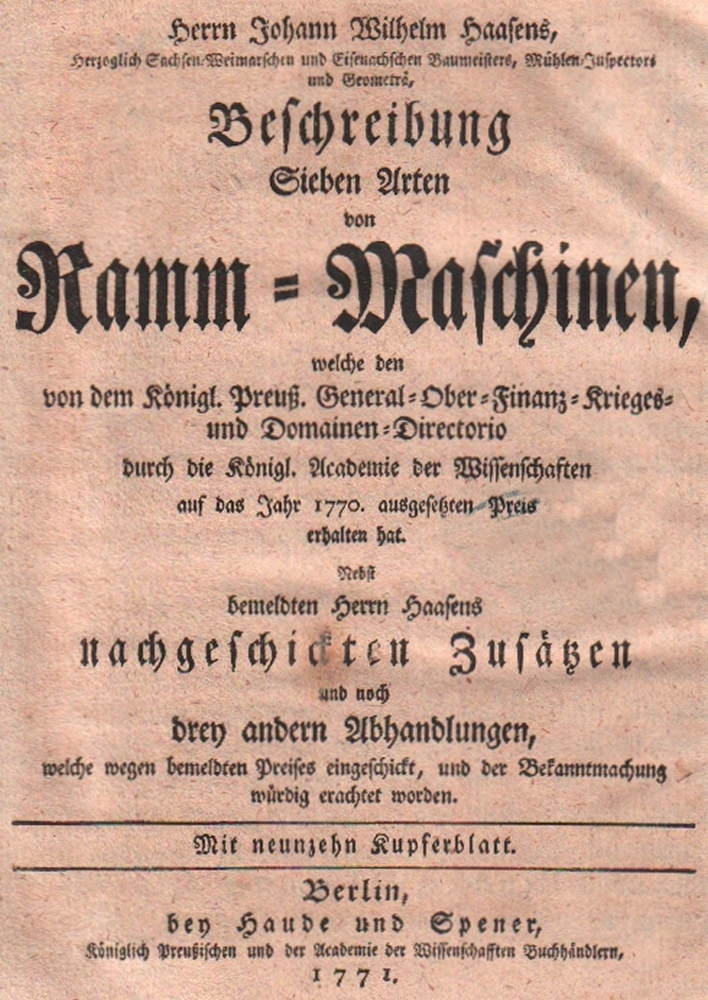102 Haase, Johann Wilhelm. Beschreibung Sieben Arten von Ramm-Maschinen, welche den von dem Königl. Preuß. General-Ober-Finanz-, Krieges- und Domainen-Directorio durch die Königl. Academie der Wissenschaften auf das Jahr 1770. ausgesetzten Preis erhalten hat. Nebst bemeldten Herrn Haasens nachgeschickten Zusätzen und noch drey andern Abhandlungen, welche wegen bemeldten Preises eingeschickt, und der Bekanntmachung würdig erachtet worden. Berlin, Haude und Spener, 1771. 8°. Mit 19 gefalteten Kupfertafeln. XII, 68 Seiten. Pappband. (49)