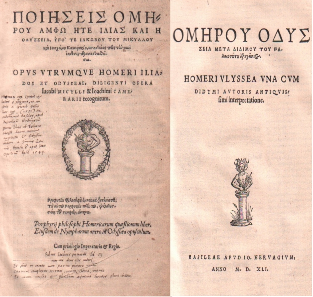 104 Homer. Opus utrumque Homeri Iliados et Odysseae (graece), diligenti Opera Iacobi Micylli & Ioachimi. Camerarii recognitum ... . 2 Teile in 1 Band. Basel, Johannes Herwagen [d. Ä.], 1541. 4°. 12 ungez. Bll. (incl Titel mit Druckermarke), 410 gez. S. 1 w. Bl. mit Druckermarke; 307 gez. S. (incl. Titel u. letztes Bl. mit Druckermarke). Orig. blindgeprägter Schweinslederband über Pappdeckel mit schönen Rollenstempeln auf den Deckeln. (11)