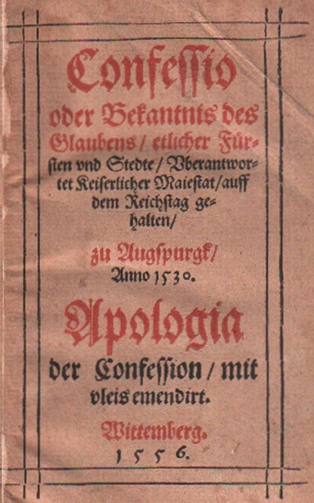 105 (Justus, Jonas ?). Confessio/ oder Bekantnis des/ Glaubens / etlicher Für=/ sten vnd Stedte / Vberantwor/ tet Keiserlicher Maiestat/ auff / dem Reichstag ge /halten/ zu Augspurgk/ Anno 1530 ... Apologia der Confession/ aus dem Latin verdeudschet durch Doctorem Justum Jonam, Wittenberg 1556. Druckvermerk letztes Blatt: Wittenberg, Georgen Rhawen Erben, 1556. 8°. 255 ungez.Bll. (Titel in rot und schwarz). Schlichter privater Pappband. (11)