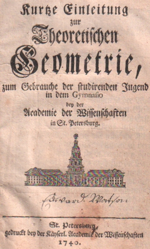 107 (Krafft, Georg Wolfgang). Kurtze Einleitung zur Theoretischen Geometrie, zum Gebrauche der studirenden Jugend in dem Gymnasio bey der Academie der Wissenschaften in St. Petersburg. St. Petersburg, Kayerl. Academie der Wissenschaften, (1740). 8°. Mit 14 Kupfertafeln und gestochener Titelvignette. 4 Bll. (inkl. Titel), 270 Seiten, 1 Bl. Pappband. (49)