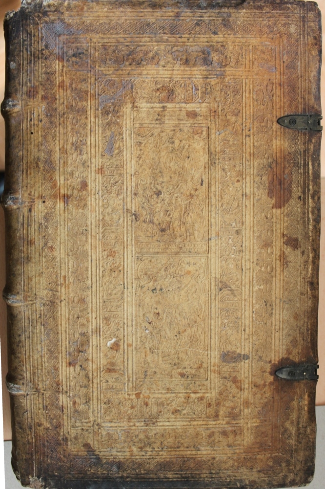 Einband ist gebräunt, auf dem Vorderdeckel mit einer Schnittlinie im