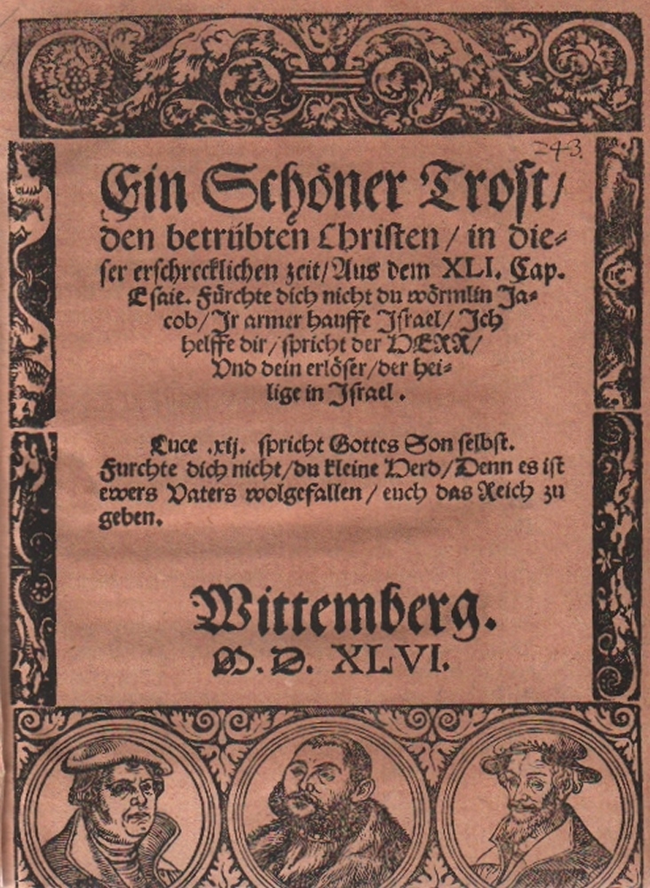 120 Naboth, Alexius. Ein Schöner Trost/ den betrübten Christen/ in die /ser erschrecklichen Zeit/ Aus dem XLI. Cap./ Esaie. Fürchte dich nicht du wörmlin Ja/cob/ Jr armer hauffe Jsrael/ Jch /helffe dir/ spricht der HERR/ vnd dein erlöser/ der hei/ lige in Jsrael... Wittemberg. 1546. 4°. 24 Bll, Titelblatt mit schöner Bordüre in unteren Teil mit den Porträts von Luther, Kurfürst von Sachsen (?) und Melanchthon. (Wittenberg, Schirlentz / Nickel, 1546). Schlichter privater Pappband. (11)