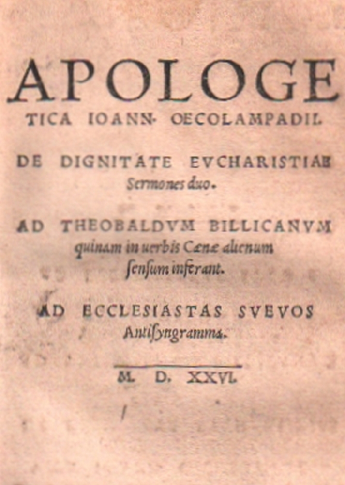 121 Oecolampadius, Joann. Apologetica. De Dignitate Evcharistiae. Sermones duo. Ad Theobaldvm Billicanvm quinam in uerbis Caenae alienum sensum inferant. Ad Ecclesiastas Svevos Antisyngramma. 8°. 152 Bll., incl. Titel. Druckermarke am Ende Zürich, Froschauer, 1526. Privater schlichter Pappband. (11)