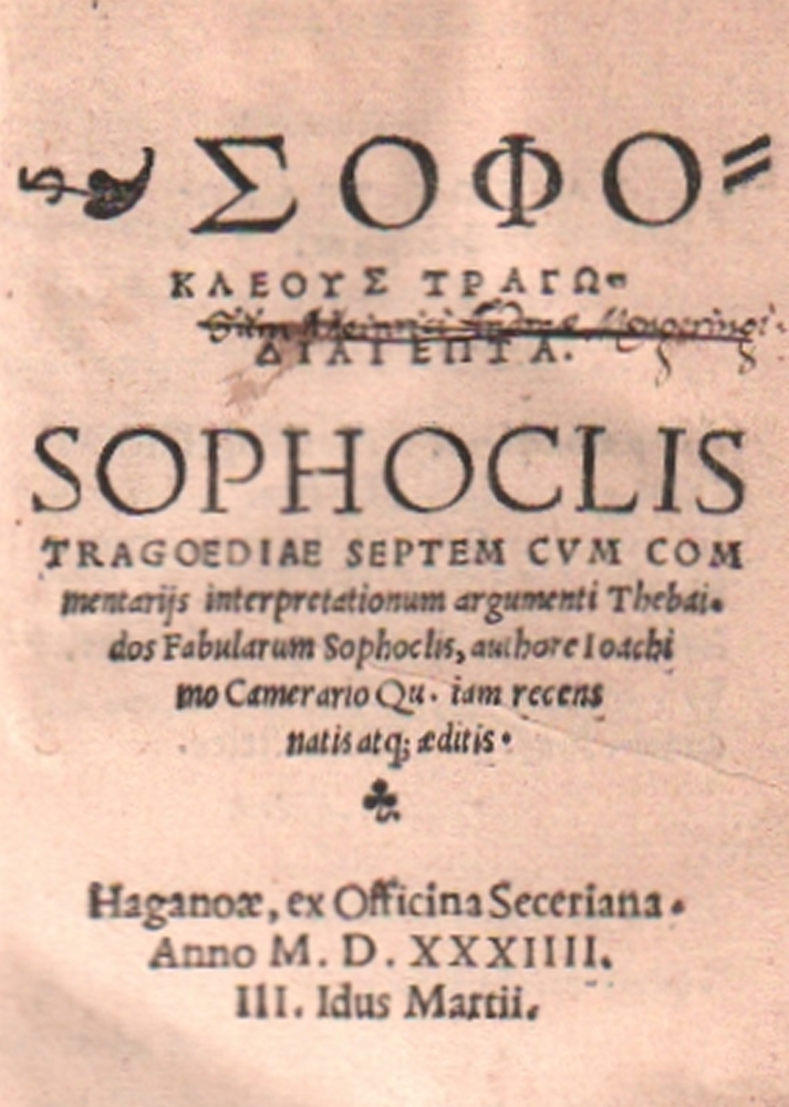 123 Sophokles. SOPHOKLEUS TRAGŌDIAI HEPTA. Sophoclis Tragoediae septem cum commentariis interpretationum argumenti Thebaidos Fabularum Sophoclis, autore Joachimo Camerario Qu. iam recens natis atq; aeditis. 2 Teile in einem Band, Griechisch und Latein. Hagenau, Setzer (Johann Erben), 1534. 8°. 228 unnum. Bll. mit Druckermarke am Ende; 95 num. Bll. mit Druckermarke am Ende. Blindgeprägter originaler Schweinslederband über Holzdeckel mit schönen Rollenstempeln und 2 Bildplatten auf den Deckeln. Die Schließbänder fehlen. (11)