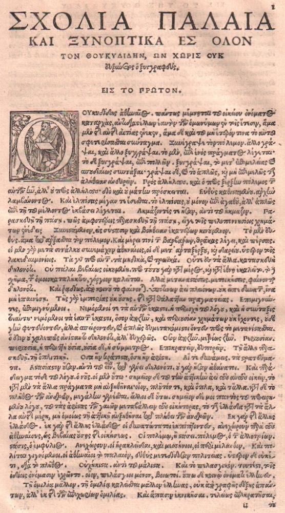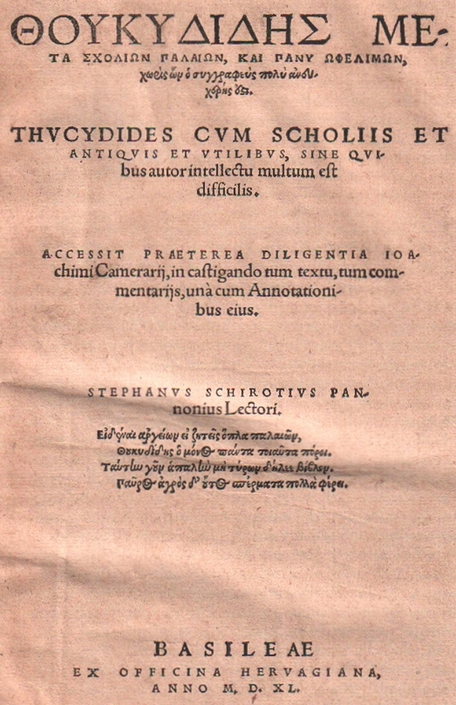 124 Thukydides. Thukydides cum scholiis et antiquis et utilibus, sine quibus autor intellectu multum est difficilis. Accessit praeterea diligentia Ioachimi Camerarii, in castigando tum textu, tum commentariis, una cum annotationibus eius. 2 Teile in 1 Band. Basel, Herwagen (Johannes d. Ä.), 1540. Folio. 12 Bll. incl Titel, 225 S. 1 Bl; 128 S. 2 Bll. (eines davon mit Druckermarke. Priv. alter Pappband. (11)