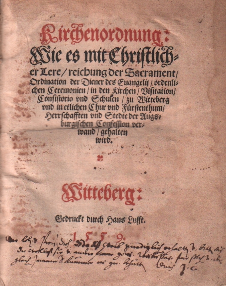 125 Wittenberg. Kirchenordnung Wittenberg. Wie es mit Christlicher Lere / reichung der Sacramente / Ordination der Diener des Evangelii / Ordenlichen Ceremonien / in den Kirchen / Visitation / Consistorio und Schulen / zu Wittenberg und in etlichen Chur und Fürstenthum / Herrschafften und Stedte der Augsburgischen Confession verwand gehalten wird. Wittenberg, Lufft, 1559. Kl. 4°. Mit schöner Holzschnitt- Initiale der Vorrede, kleinen Textinitialen, gedruckten Noten und Druckermarke am Schluß. 144 num. Bll. Defekter Einband der Zeit, der zur Hälfte mit blindgeprägtem Leder bezogen. (11)
