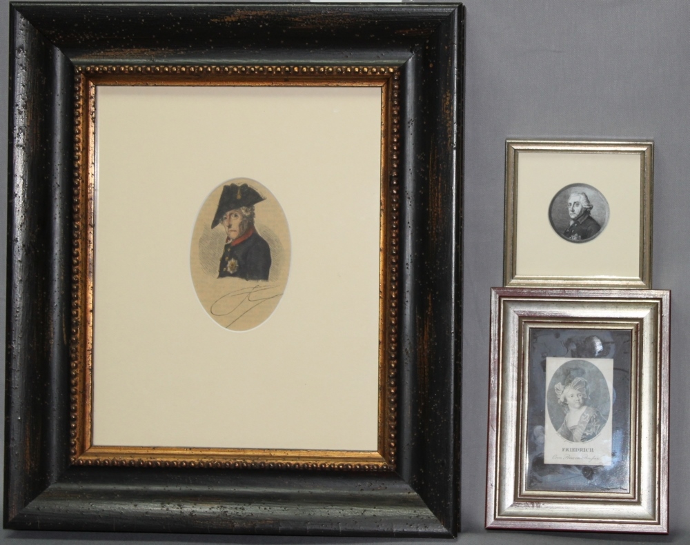 126 Friedrich der Große. Drei Porträt - Abbildungen des Königs, aus der Zeit um 1860. Unterschiedliche graphische Techniken. Verschiedene Größen und Abmessungen. Alle gerahmt. (31)