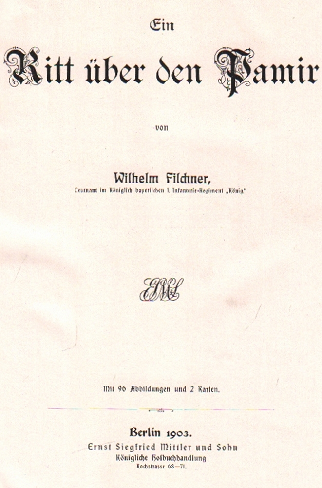 168 Asien. Filchner, Wilhelm. Der Ritt über den Pamir. Berlin, Mittler, 1903. 4°. Mit 96 Textabb. und 2 gefalteten Karten eine davon farbig. VIII, 1 Bl. Inhalt, 238 Seiten. Hellblauer Halbleinenband mit Titeldruck und leichten Verzierungen in Gold auf dem Vorderdeckel und Rücken. (12)