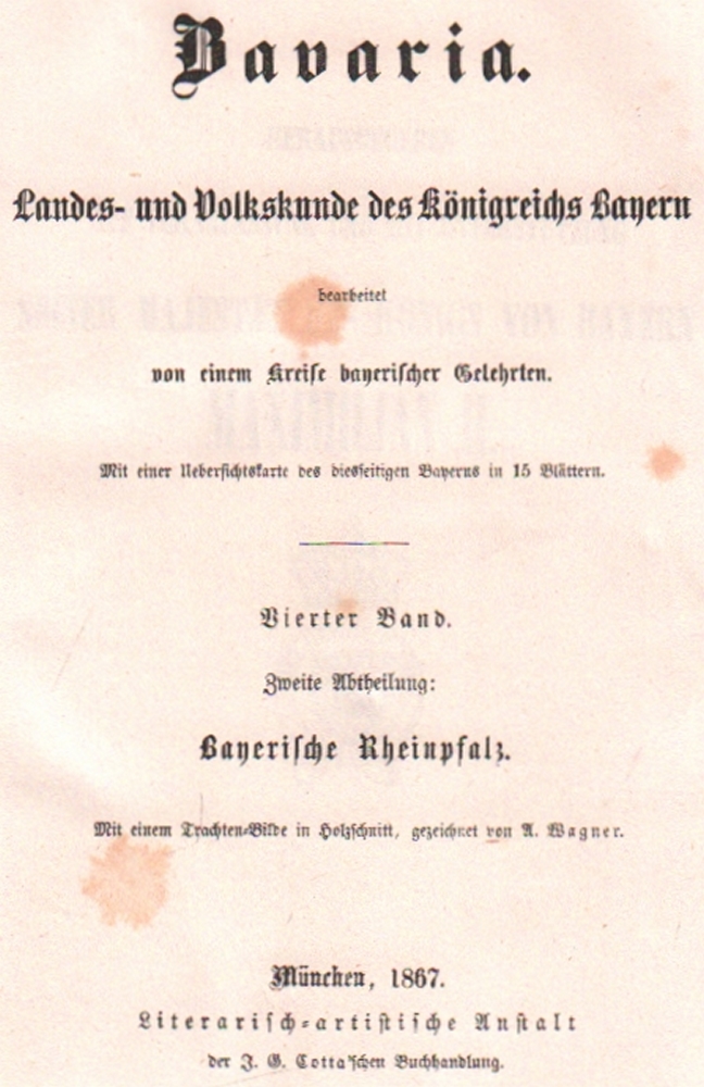 170 Bayern. Bavaria. Landes - und Volkskunde des Königreichs Bayern bearbeitet von einem Kreise bayerischer Gelehrter. 4 Teile und Ortslexikon in zus. 9 Bänden (der Atlasband fehlt). München, Literarisch - artistische Anstalt, 1860 - 1867. Lex 4°. Mit 2 gestochenen Titeln, und 8 Frontispizen (Trachtentafeln) im Holzstich. Gleichförmig ausgeblichene Halblederbände mit goldgeprägten Rückenschildchen. (12)