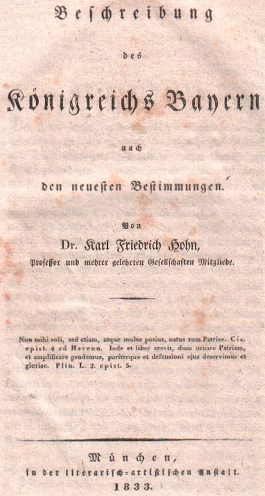 174 Bayern. Hohn, Karl Friedrich. Beschreibung des Königreichs Bayern nach den neuesten Bestimmungen. “Non mibi, soli, sed etiam, atque multo potius, natus sum Patrae“. // Nicht nur für mich selbst, sondern auch und noch viel mehr bin ich die Nase der Partei… München, Literarisch – artistische Anstalt, 1833. 8°. Mit einer Falttafel. XII, Vorwort und Inhalt, 658 Seiten, 1 Bl. Druckfehler. Schlichter Pappband mit goldgeprägtem Rückenschild. (12)