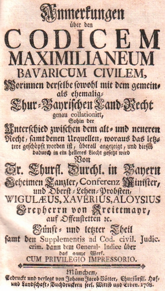 175 Bayern. Kreittmayr, W. X. A. v. Anmerkungen über den Codicem Maximilianeum Bavaricum Civilem… Chur- Bayrischen Land – Recht genau collationiert… 5 Teile in 5 Bänden (ohne die drei Ergänzungsbände). München, Vötter, 1759 – 1768. Lex. 8°. Orig. braune Lederbände mit dekorativer Rückenvergoldung und 2 goldgeprägten Rückenschildern. (12)