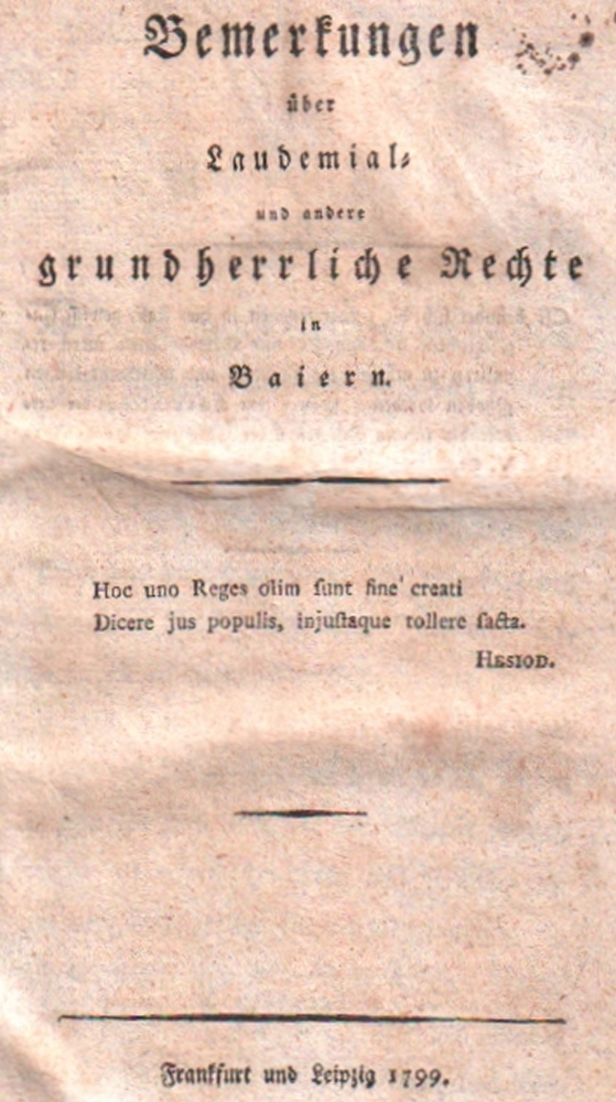176 Bayern. (Rottmanner, Simon). Bemerkungen über Laudemail=, und andere grundherrliche Rechte in Baiern. Frankfurt und Leipzig, 1799. 8°. XXIV, 206 Seiten. Halblederband der Zeit mit leichter Rückenvergoldung und goldgeprägtem Rückenschild. (12)