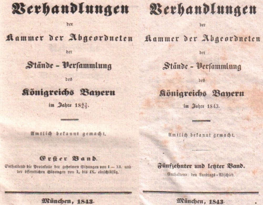 177 Bayern. Ständeversammlung. Verhandlungen der Kammer der Abgeordneten der Stände – Versammlung des Königreichs Bayern im Jahre 1842 – 1843. Amtlich bekannt gemacht. Bände 1 – 15 letzter Band “Landtags – Abschied“. Enthaltend sind die Protokolle der geheimen Sitzungen und der öffentlichen Sitzungen. Beiliegen die Beilagenbände: I –IV und VI - X in 10 Bänden (Bd. 9 in 2 Bde.) Marmorierte Pappbände mit gedruckten Rückenschildern. (12)