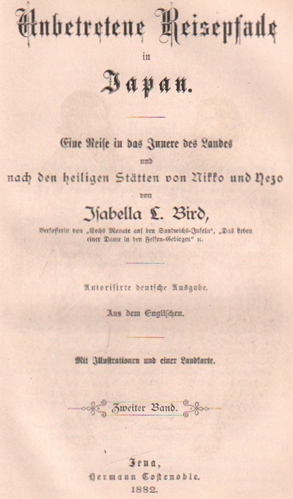 182 Japan. Bird, Isabella L. Unbetretene Reisepfade in Japan. Eine Reise in das Innere des Landes und nach den heiligen Stätten von Nikko und Yezo. Autorisierte deutsche Ausgabe. Aus dem Englischen. 2 Bände in 1 Band. Jena, Costenoble 1882. 8°. Mit 2 Frontispizen und vielen Textabb. und einer getönten und gefalteten Karte. XI, 299; VII, 235 S. Orig. illustrierter grüner Leinenband mit goldgeprägtem Titeldruck auf Vorderdeckel und Rücken. (12)