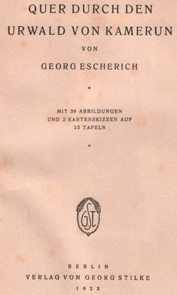 183 Kamerun. Escherich, Georg. Quer durch den Urwald von Kamerun. Berlin, Stilke, 1923. 8°. Mit 2 Kartenskizzen und 38 Abb. auf Tafeln incl. Frontispiz. 291 S. Orig. grüner Halbleinenband mit 1 Abbildung. (12)