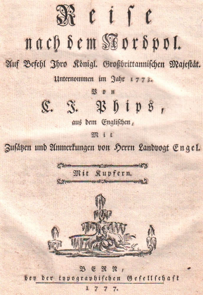 184 Nordpol. Phipps, Constantin John. Reise nach dem Nordpol. Auf Befehl Ihro Koenigl. Großbrittannischen Majestät. Unternommen im Jahr 1773. aus dem Englischen. Mit Zusätzen und Anmerkungen von Herrn Landvogt Engel. Zwei Teile in einem Band. Bern, Typographische Gesellschaft, 1777. 4°. Mit Titelvignette, 6 Kupfertafeln, 5 Kupferkarten auf 4 Tafeln, sowie 3 Tabellen, alle Teile gefaltet. 3 Bll. Vorrede, Einleitung unvollständig vorhanden nur Seite IX / X und 1 Bll Verzeichnis; 122 Seiten Tagebuch; Zwischentitel [Neuer Versuch … Anhang zu Phip(p)s Reisen], 304 S. Anhang, 1 Bl. Druckfehler. Schlichter marmorierter Pappband. (72)
