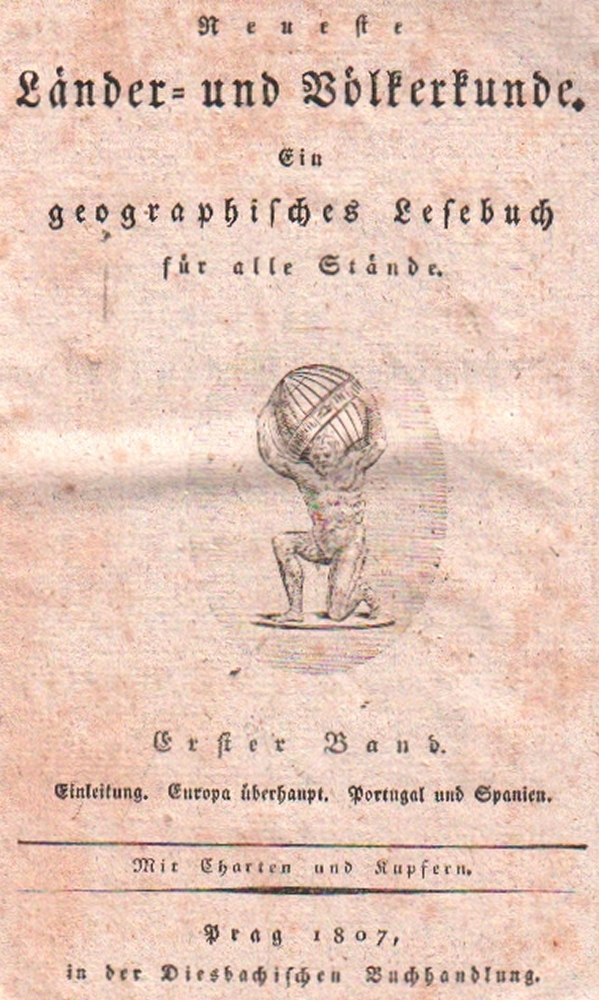 185 Portugal. Spanien. Neueste Länder und Völkerkunde. Ein geographisches Lesebuch für alle Stände. I. Band. Prag, Diesbach, 1807. 8°. Titel mit kleiner Vignette. Zus. 280 Seiten und den eingebundenen gelben lithographierten Pappumschlägen. Orig. grüner Pappband mit goldgeprägten rotem Rückenschild. (12)