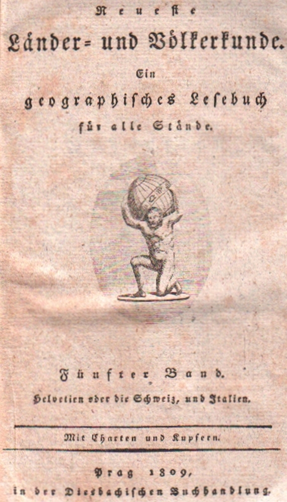 186 Schweiz. Italien. Neueste Länder und Völkerkunde. Ein geographisches Lesebuch für alle Stände. V. Band. Prag, Diesbach, 1809. 8°. Titel mit kleiner Vignette. Zus. 248 Seiten und den eingebundenen gelben lithographierten Pappumschlägen. Orig. grüner Pappband mit goldgeprägten rotem Rückenschild. (12)