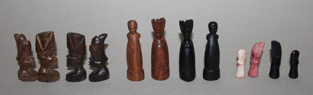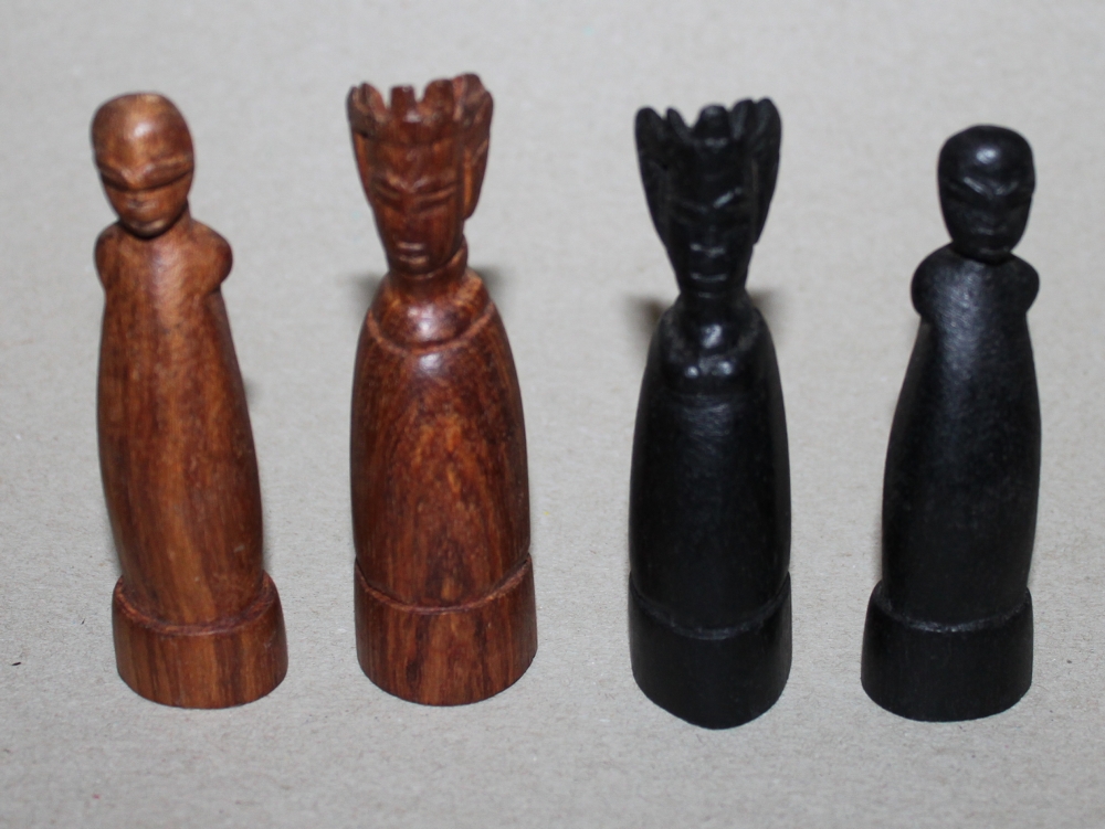 huts. Enclosed with a small African chess set made of wood. One side stained in