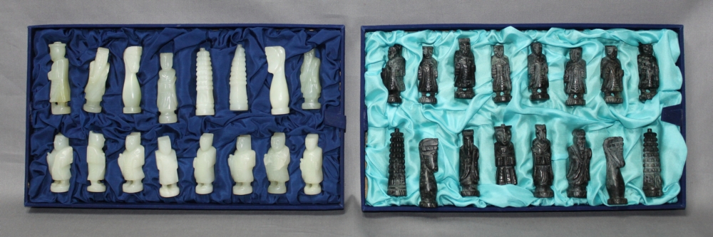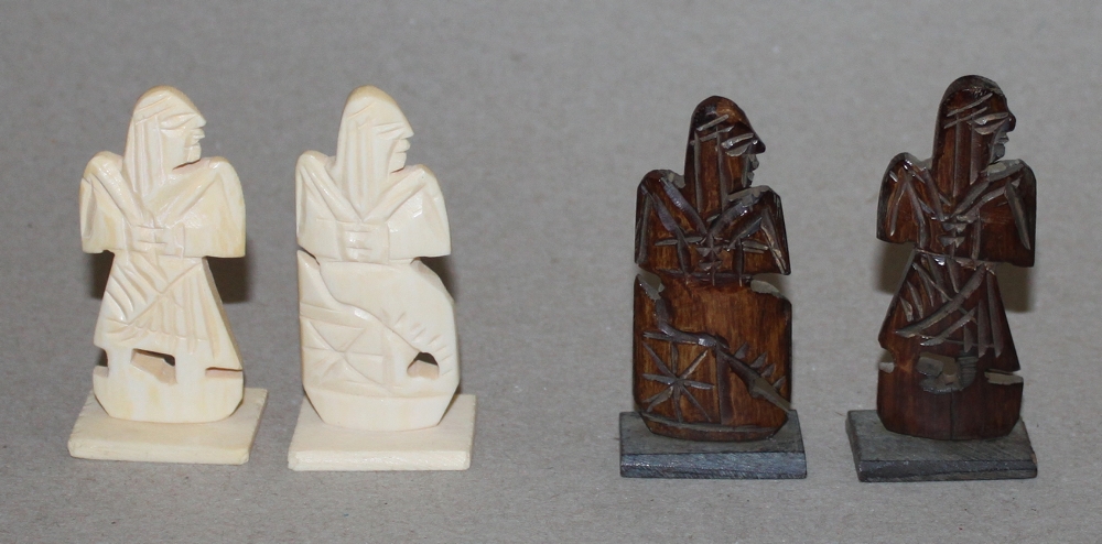 Two chess sets made of wood in traditional African style. One side stained light brown,