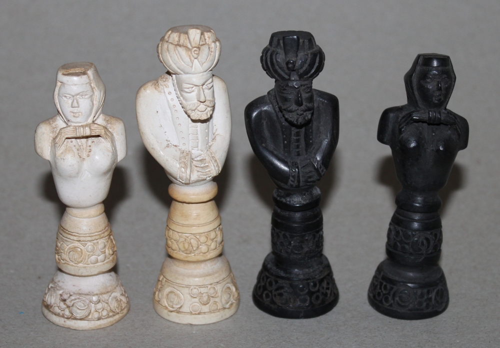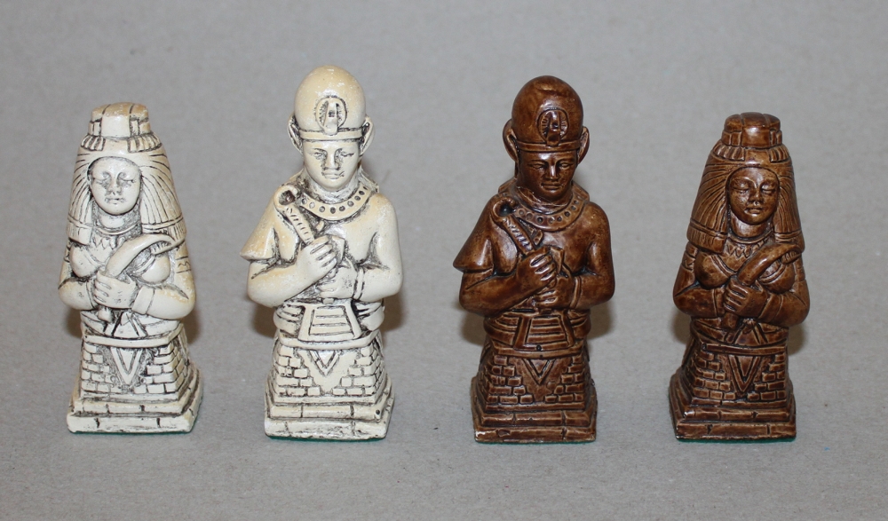 Chess set made of artificial stone - figures of the antique Egypt. One side stained in middle brown, the other is white –grey. Produced in