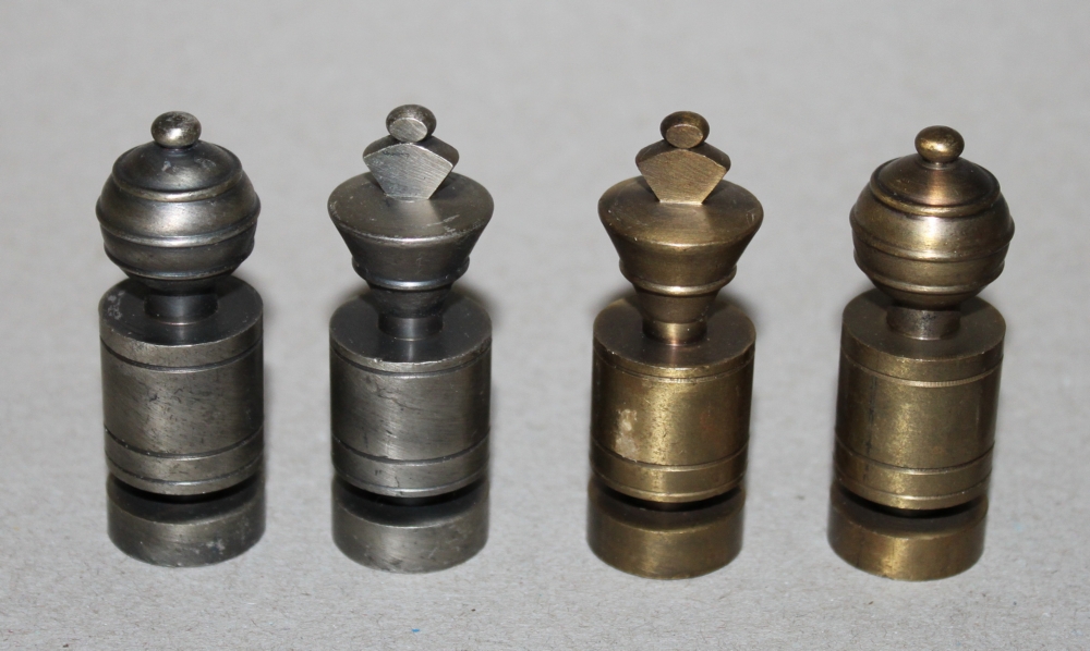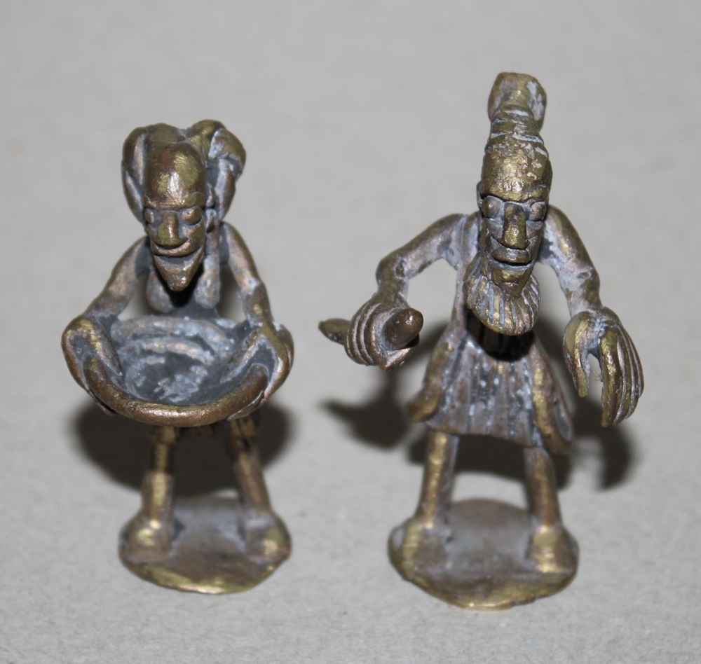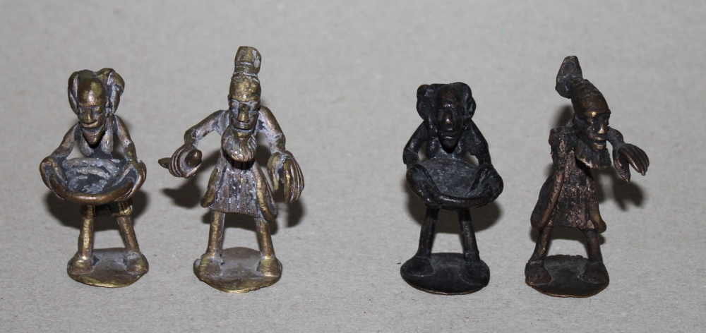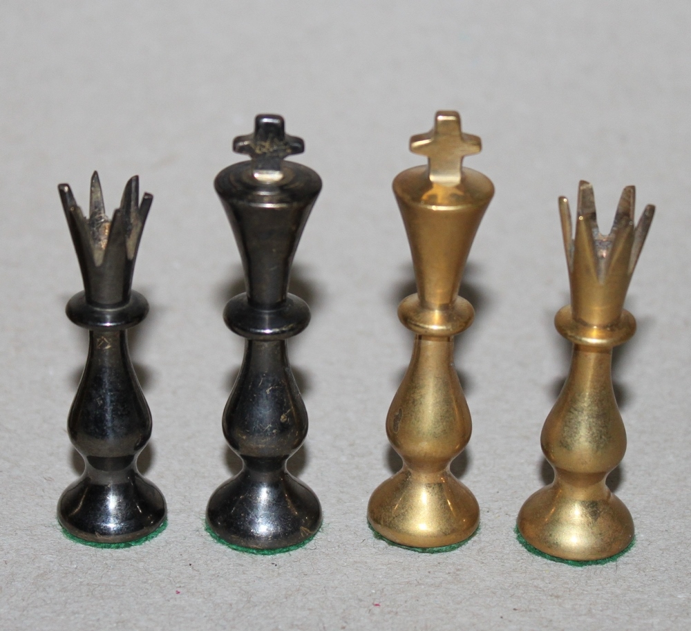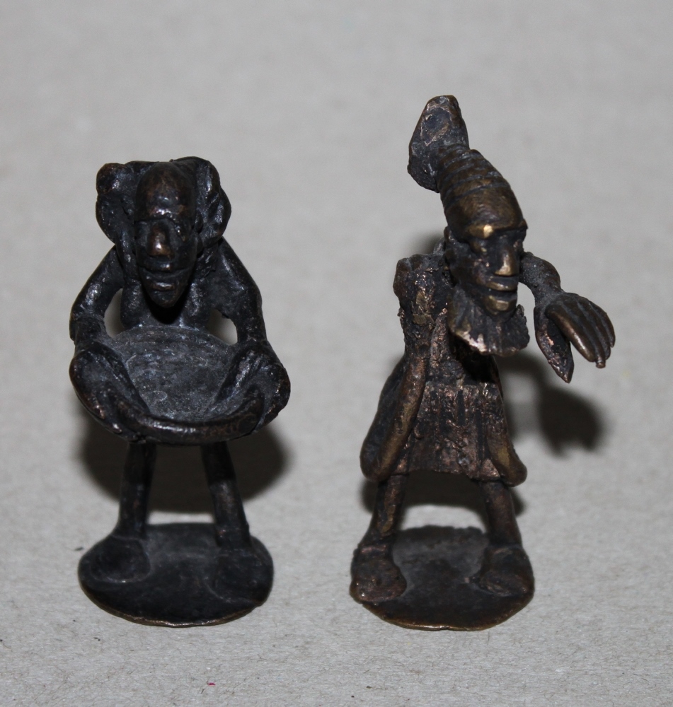 #274 Afrika. Nigeria. Schachfiguren aus Metall (Messing). Volkskundliche Metallfiguren im afrikanischen Stil, unterschiedlich patiniert, eine Partei in hell, die andere in dunkel. Nigeria, um 1980. Größe Spielfiguren: König 6,5 cm; Bauer 5,5 cm. (24)