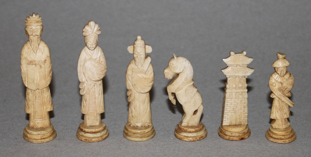 #270 Afrika. Ägypten. Schachfiguren aus Bein - Figuren nach Motiven aus dem alten Ägypten im historischen Stil. Beide Parteien sind gleich, eine Partei in hellbraun, die andere naturfarben. Produktion aus der zweiten Hälfte des 20. Jhrdts. Höhe König 10,6 cm; Bauer 7,2 cm. (26)