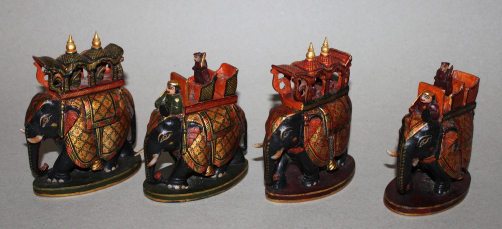 #330 Europa. Russland. Volkskunst. Zwei unterschiedlich farbige Schachspiele aus Holz. Die Parteien sind jeweils farblich unterschiedlich gestaltet. Russland, Produktion 2. Hälfte des 20. Jhrdts. Verschiedene Größen und Dimensionen. (26)